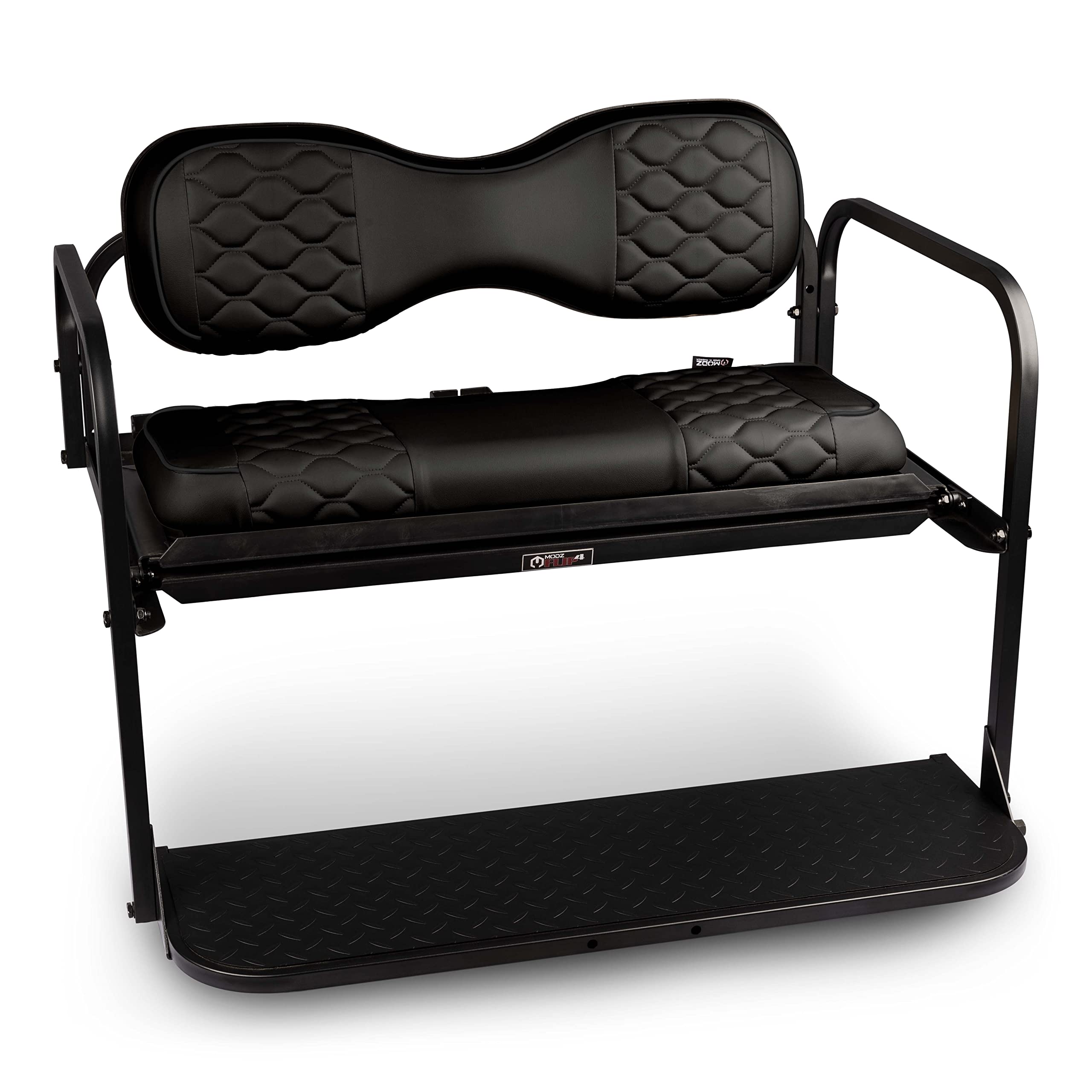 [EASY INSTALLATION ON EZGO TXT 1995-UP GOLF CARTS] Featuring a simple, bolt-on design, these rear seat kits are easy to install with a basic set of hand tools. In case you might need additional assistance, we’ve also prepared easy-to-follow installation videos. [CUSTOM DELUXE STYLE AND DESIGN] The MODZ RS features 6 attractive pattern options and 6 base colors for you to choose from to style up your golf cart. Designed to complement the MODZ FS seat series, these rear covers come pre-installed on the MODZ Flip4 rear seat for the ultimate upgrade. [MULTI-PURPOSE USAGE] The MODZ RS are luxury rear seat covers pre-installed on the MODZ Flip4 rear seat - one of the most popular golf cart rear seat kits in the industry. Not only does the Flip4 increase the seating capacity of your cart, but it also fulfills utility needs such as cargo transportation. With the MODZ RS, you can enjoy both the functional benefits of this seat and its eye-catching design features. [BUILT TO LAST] These golf cart rear seat covers are crafted with Marine Grade Vinyl, making them fade and wear resistant so you can continue to enjoy them time and time again. The MODZ Flip4 - for which they are pre-installed - features a simple bolt-on design for quick and easy installation. With a high-density polyethylene diamond textured cargo bed, you can count on this multifunctional seat’s durability. [HAND-STITCHED DETAILS] These seats feature hand-stitched details from our team of skilled craftsmen, right here in Austin, Texas. At MODZ, we’re passionate about the golf cart products we provide, so it’s only expected that we hire the best to produce the best. We’ve taken our best-selling MODZ Flip4 rear seat and kicked it up a notch! Now available with a subtly designed rear seat cover that complements the bold style of our newly redesigned MODZ FS2 front seat. Enjoy custom options that give you more choice over one of your cart's most distinct features with 6 base colors, 6 pattern options and 16 accent colors to choose from.
