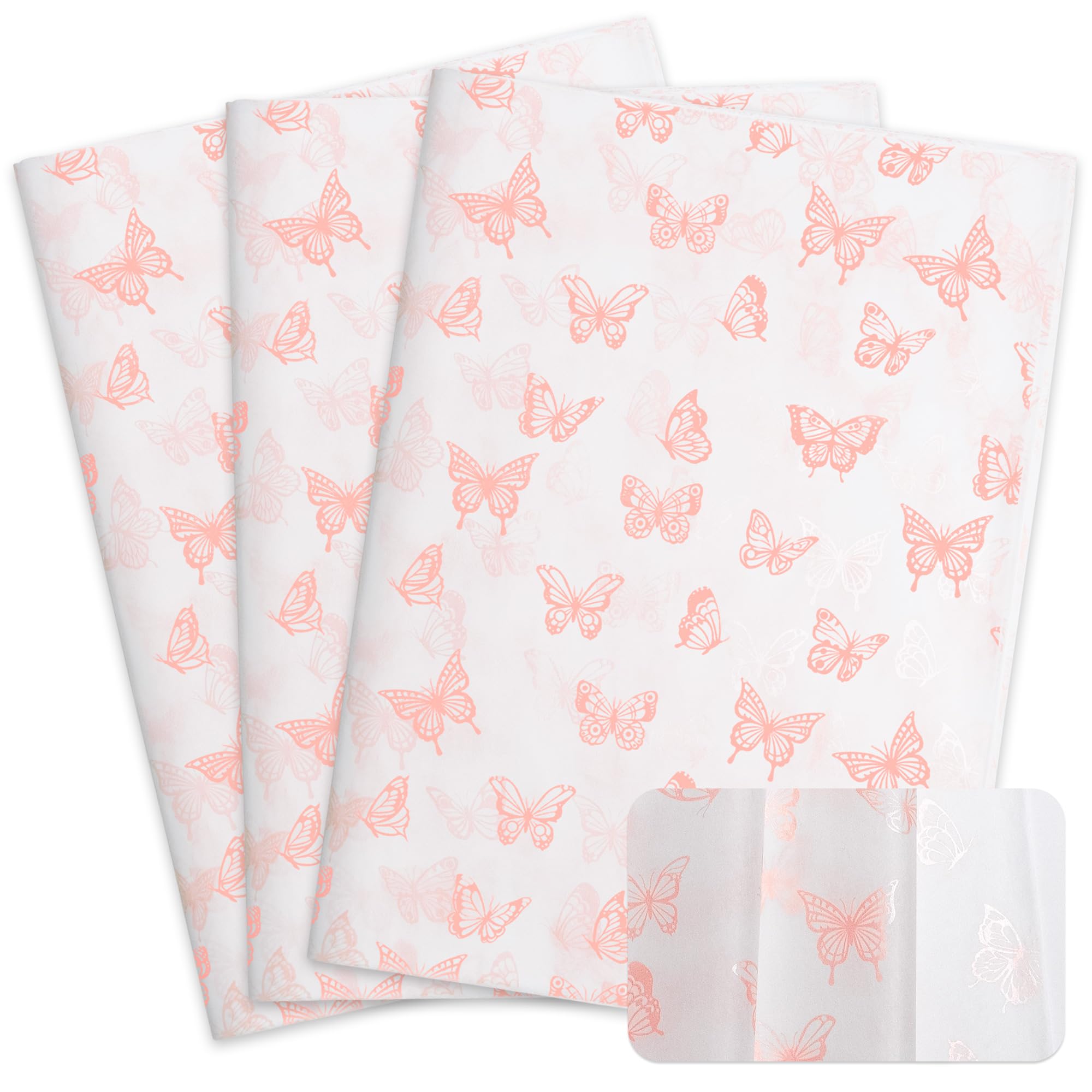 Package Includes:60 sheets metallic pink butterfly tissue paper bulk.Size:19.7 inch x 13.8 inch.Remind you that this size tissue may NOT be suitable for packing large size gifts. Salmon Pink butterfly Design:The tissue paper has white background and pink butterfly pattern on it. It's very beautiful.Perfect pink butterfly tissue paper for small business. Eco-friendly Material:The pink butterfly tissue paper is made of high quality paper, environmentally friendly . High Quality:The butterfly tissue paper is made of high quality paper,not easy to tear. The pink butterfly pattern is clear and bright, suitable for wrapping small gifts and business packaging.Please NOTE that these butterfly gift tissue paper are printed on ONE SIDE. Widely Use:You can use these butterfly tissue paper to wrap your Birthday,Mother's Day,Thanksgiving,Baby Shower,Christmas and New Year gifts.You can also DIY them into paper poms and other party decorations. NOTE: Remind you that this tissue may NOT be suitable for packing large size gifts. Features: 60 sheets white with pink butterfly pattern tissue paper,so pretty. The tissue paper can be used with a gift bag or individually.Very suitable for gift wrapping.It can also be used to make handicrafts like pompoms. Specifications: Size:50 x 35cm (19.69" x13.8") Styles:White with pink butterfly pattern. Material:Recyclable paper Package includes: 60 x White tissue paper with pink butterfly pattern