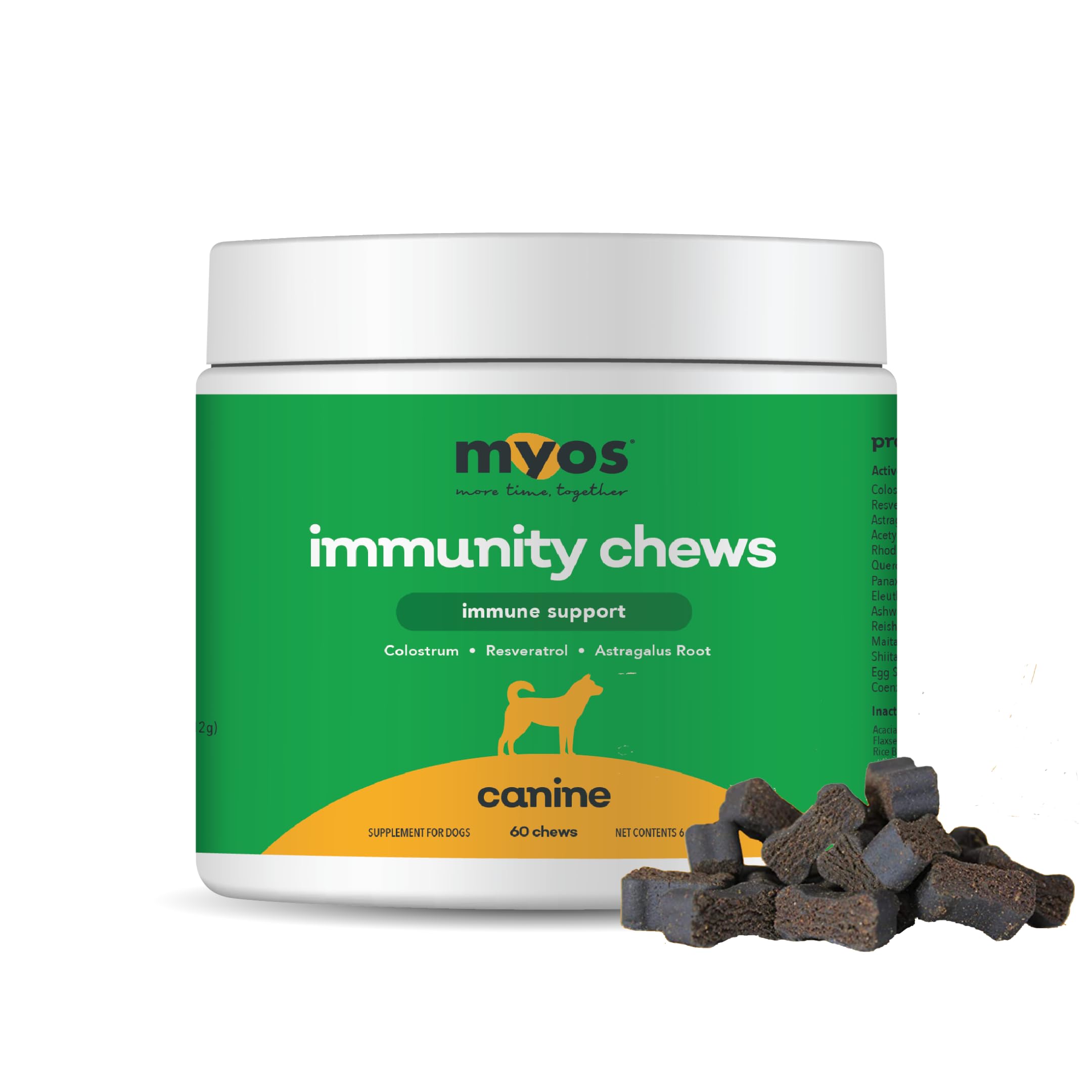 IMMUNE SUPPORT - Contains colostrum, resveratrol, and astragalus root to boost immune system function and overall health, keeping your dog protected year-round. ANTIOXIDANT RICH - Packed with antioxidants like quercetin and resveratrol to combat oxidative stress, promote longevity, and support a healthy aging process in dogs. ADAPTOGENIC BENEFITS - Includes adaptogens like Rhodiola Rosea, Panax Ginseng, and Ashwagandha to enhance stress resilience and improve your dog’s overall vitality. CELLULAR HEALTH - Acetyl L-Carnitine and Coenzyme Q10 support cellular energy production and cardiovascular health, promoting optimal function at the cellular level. MUSHROOMS - Features Reishi, Maitake, and Shiitake mushroom extracts, known for their immune-boosting properties and ability to support general wellness. TASTY & NATURAL - Made with natural ingredients and flavors, including chicken liver, making these chews highly palatable and easy to administer daily. EASY DOSING - Simple to incorporate into your dog’s routine with dosing recommendations based on weight, ensuring personalized immune support for every size dog. MYOS Immunity Chew is a powerful daily supplement formulated to support your dog's immune system and overall health. Packed with a unique blend of natural ingredients, including colostrum, resveratrol, astragalus root powder, and a variety of mushrooms like Reishi, Maitake, and Shiitake, these chews provide comprehensive immune support to keep your pet healthy and active. Colostrum helps boost immune response and supports gut health, while resveratrol and astragalus root are rich in antioxidants that combat oxidative stress, promoting longevity and vitality in your canine companion. This supplement also includes a selection of adaptogenic herbs such as Rhodiola Rosea, Panax Ginseng, Eleuthero Root, and Ashwagandha, known for their ability to enhance resilience to stress and support overall well-being. Ingredients like Acetyl L-Carnitine HCl aid in cellular energy production, and Coenzyme Q10 supports cardiovascular health, ensuring your dog receives a holistic approach to immune system support. MYOS Immunity Chews are crafted with natural flavors, including chicken liver, making them a tasty and irresistible treat for dogs of all sizes. With simple dosing based on your dog’s weight, these chews are easy to incorporate into your pet's daily routine. Whether you're aiming to boost your dog’s immune defenses or simply maintain optimal health, MYOS Immunity Chew provides the essential nutrients your dog needs for a vibrant, healthy life.