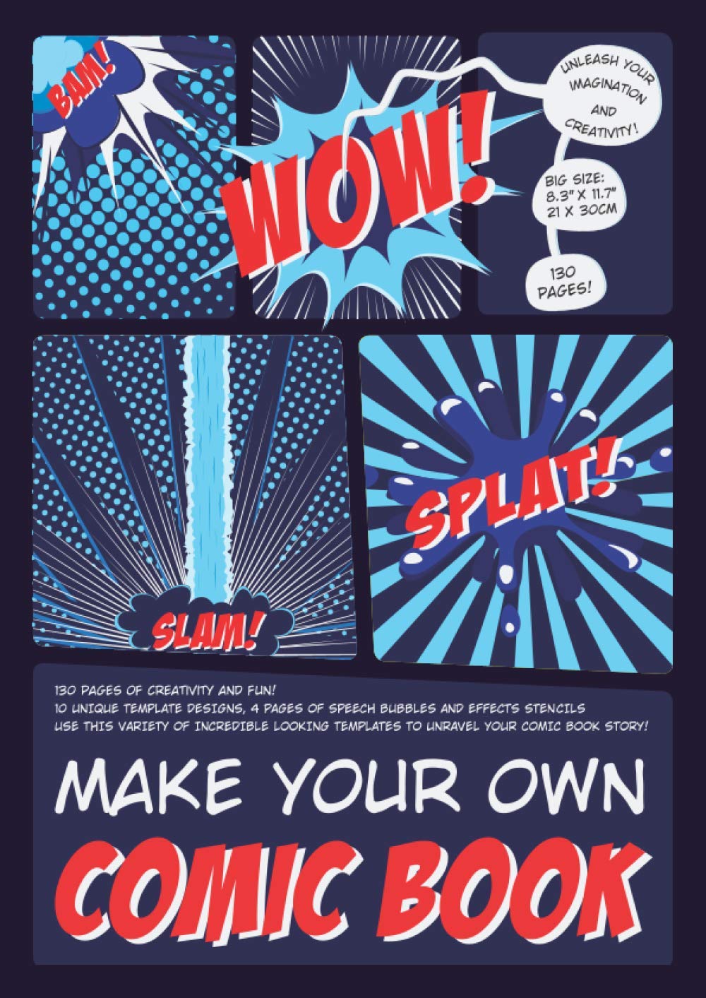 Make Your Own Comic Book Use this 130 page long large format book to create your own comic book story. This book will make a perfect gift for an aspiring artist or cartoonist of any age. Filled with 10 unique templates each featuring a variety of panels with rounded corners that are sure to enhance your comic story. Product Details: 4 additional pages with speech bubbles and various visual effects that are ready to be cut out or stencilled and applied to your comic or manga story for greater impact. - Includes ready to fill in Table of Contents - Large size: A4 measures 21x30cm (8.3"x11.7") - 130 pages long with all pages numbered - 10 unique layouts to provide variety of looks - Panels have rounded corners to make your story stand out - Good quality drawing paper keeps ink on one side of a page - Great for artists of any age - Can be used for drafting of a comic or manga story - Matte finish cover
