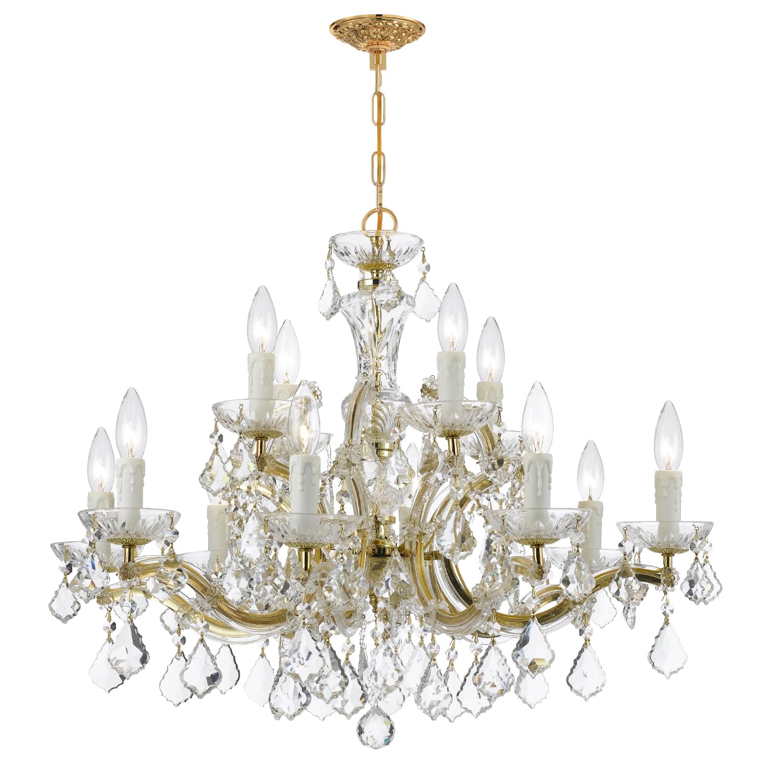 Maria Theresa collection features a versatile traditional design. Relies on classic elements from the 18th and 19th centuries that lends a refined and elegant atmosphere. The glass paneled arms of the Maria Theresa collection is a true nod to the classics. Gold metal finish, perfect for traditional settings. 12 light 60- watt, E12 Candelabra base. Dimensions: 30"W x 23"H x 30"D Authorized for use in damp, high-humidity interior locations or protected exterior locations. Meets United States UL Underwriters Laboratories Product Safety Standards. This classical crystal collection comes in chrome or gold and a variety of crystal upgrades.
