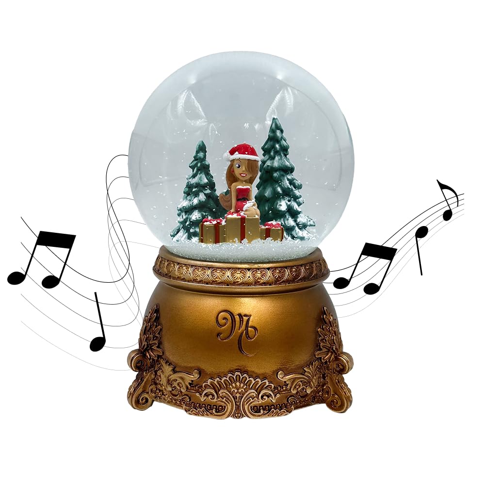 Amazon Exclusive Hand-painted holiday scene featuring Mariah Carey in her signature red dress surrounded by snow-covered trees and gift boxes Antique gold base embossed with the “MC” monogram and ornate trim details Official merchandise from the Christmastime by Mariah Carey collection Glass dome with glitter snow effect and manual wind-up crank on bottom of musical base that plays the classic holiday instrumental, "All I Want For Christmas is You." A beautifully detailed collectible that brings holiday magic to your home