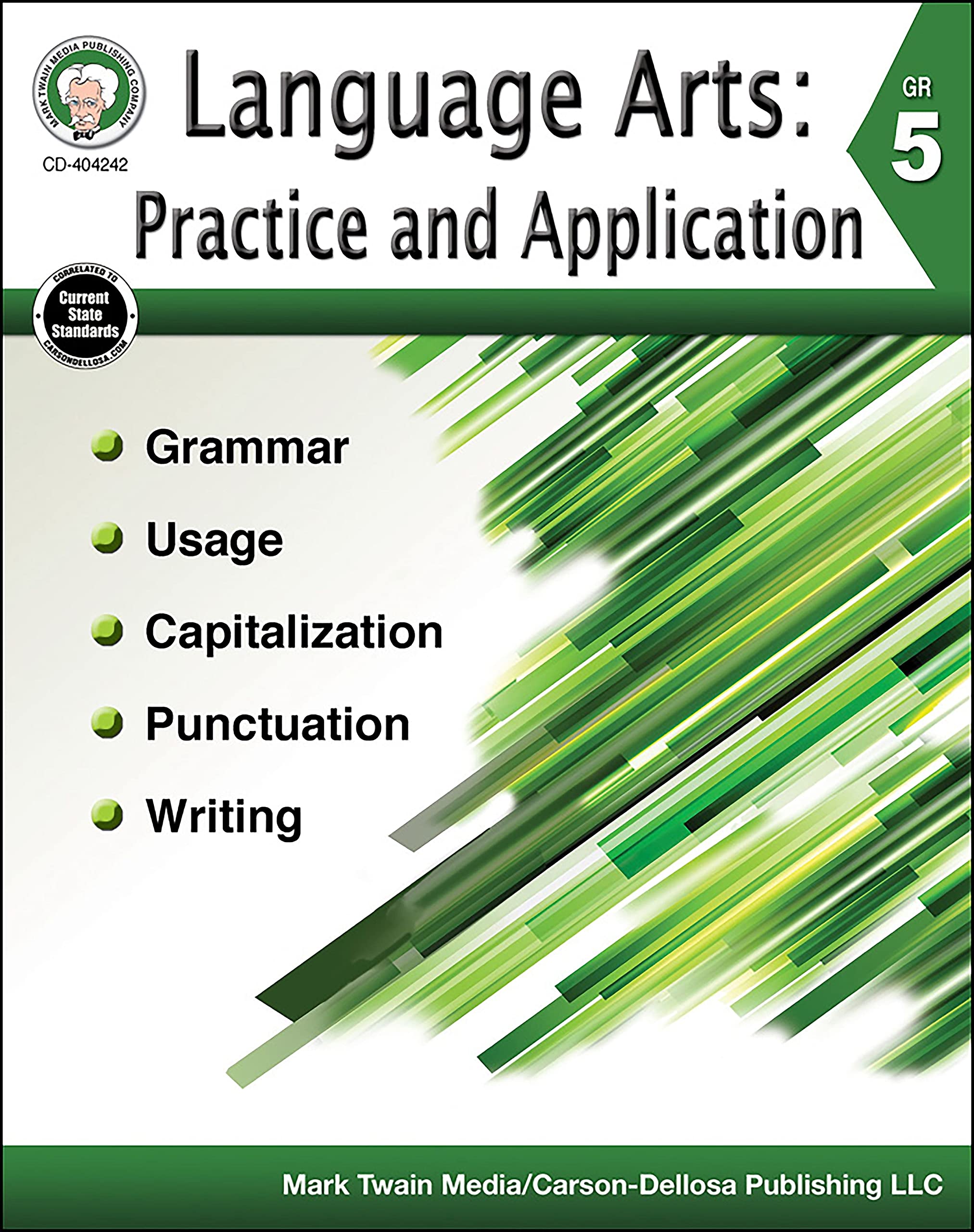 Language Arts: Practice and Application for grade 5 focuses on the essential skills and concepts students need to become proficient at communication. Complete with writing prompts and test-taking tips, this series enhances your ELA curriculum by introducing and reinforcing grammar, capitalization, punctuation, and usage. Mark Twain Media Publishing Company specializes in providing engaging supplemental books and decorative resources to complement middle- and upper-grade classrooms. Designed by leading educators, this product line covers a range of subjects including math, science, language arts, social studies, history, government, fine arts, and character.