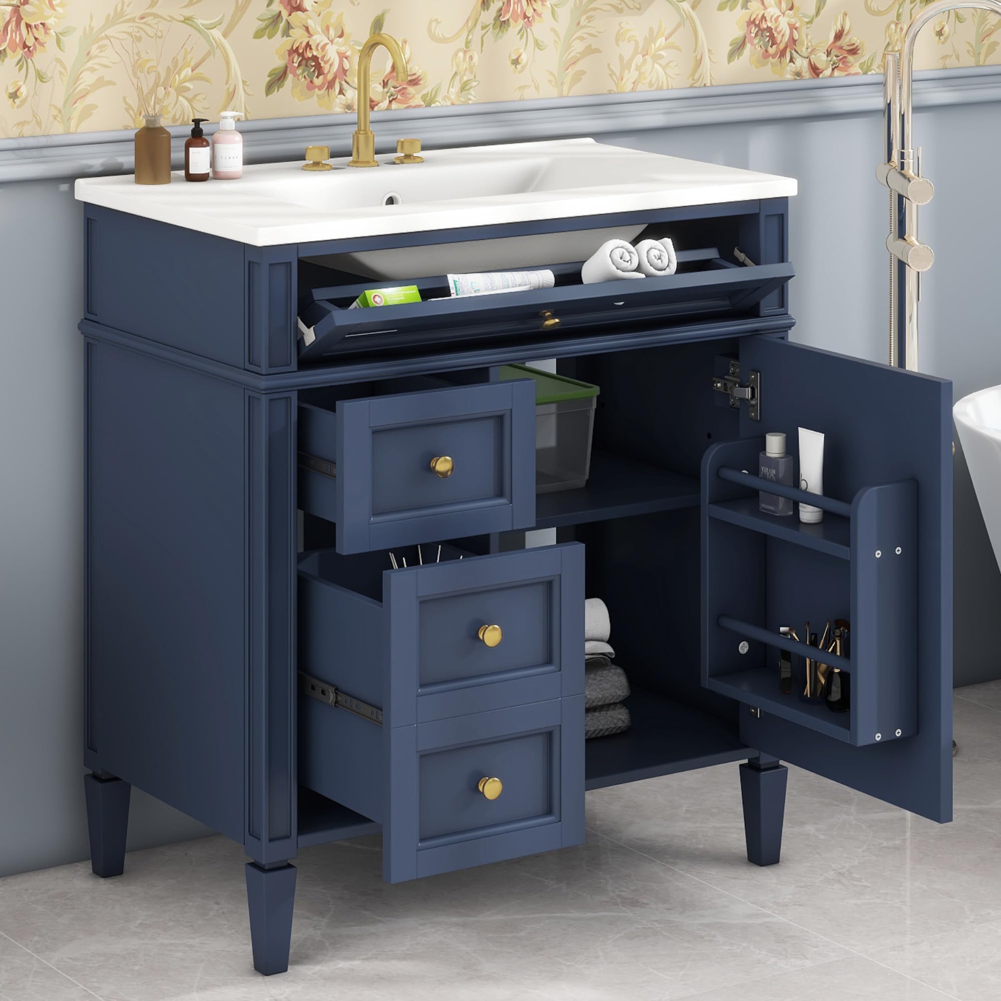 Marzzi 30" Modern Single Sink Bathroom Vanity with Storage Cabinet, 2 Drawers & Tip-Out Drawer, Solid Wood Frame Bathroom Vanity Cabinet