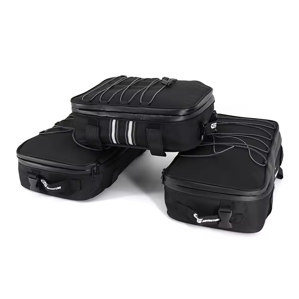 Special -strip with Velcro for secure attachment to the case. Expandable up to 20 liter maximum capacity. Expands/compacts with perimeter zipper. Crossed shock cords on top for quickly securing gloves, hat, etc. Ergonomic zipper pulls. Waterproof, Teflon-coated CORDURA weave material. Strong, abrasion and fade resistant. They are attached to the vario panniers with a belt that completely covers the bag, two stretch velcro and a belt that joins together passing under the saddle with safety. A belt is also used as a shoulder strap for easy transport. Ergonomic carrying handle. Lightweight.Waterproof zippers. Fitment: