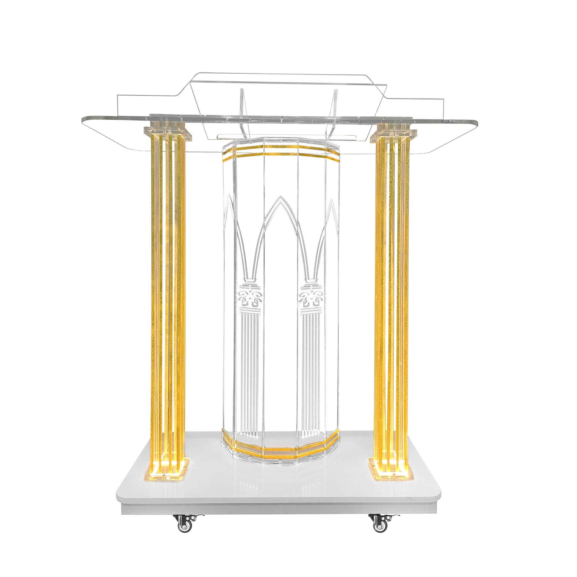 【High Clarity Acrylic】This lectern boasts transparent acrylic panels, featuring 10mm thick side risers and an 8mm thick base. Dimensions measure 39.3" L * 15.7" W * 45.6" H (100 * 40 * 116cm). It's lightweight yet robust, resistant to yellowing, cracking, deformation, water, and scratches, easily cleaned with a damp cloth.Additionally, this lectern incorporates an embossed technique, featuring gold wire patterns embedded on the pillars and front panel, exuding a noble and elegant aura. 【LED Warm Illumination + Ornate Engravings】This podium features warm LED lighting for audience engagement. Robust side acrylic columns ensure stability, while a central support panel displays intricate carvings, elevating its visual appeal. 【Spacious Presentation Surface】Our LED church lectern provides a broad, smooth tabletop with a paper stop design, angled for easy reading. The widened surface enhances convenience for reading and item placement, allowing greater expression on stage. 【Effortless Assembly & Portability】Assembly is effortless with a few acrylic plates and screws, taking under 10 minutes. Equipped with 4 movable casters, 2 with brakes, for easy transport and secure positioning. 【Versatile Usages】Ideal for churches, conference rooms, classrooms, malls, and parties, this lectern with LED lighting invigorates presentations. For inquiries about the stand, please contact us for prompt assistance. Dimensions: 39.4 x 15.7 x 45.7 inches (L 100 x W 40 x H 116cm) Material: Crafted from Acrylic, MDF Base, and Equipped with LED Lights Mobility and Convenience: This acrylic lectern is designed with wheels, ensuring effortless mobility and portability. Illuminated LED Strip: The standalone lectern features warm LED lighting (single-color) placed at the bottom, creating a serene ambiance suitable for discussions, teaching, or presentations. Just plug in to illuminate. Its luminous design adds an elegant touch to any environment. Adaptable Utility: Ideal for auditoriums, classrooms, corporate settings, and catering services. Its ergonomic design enhances various settings and can also function as a standing desk for personal study or work in a home office.