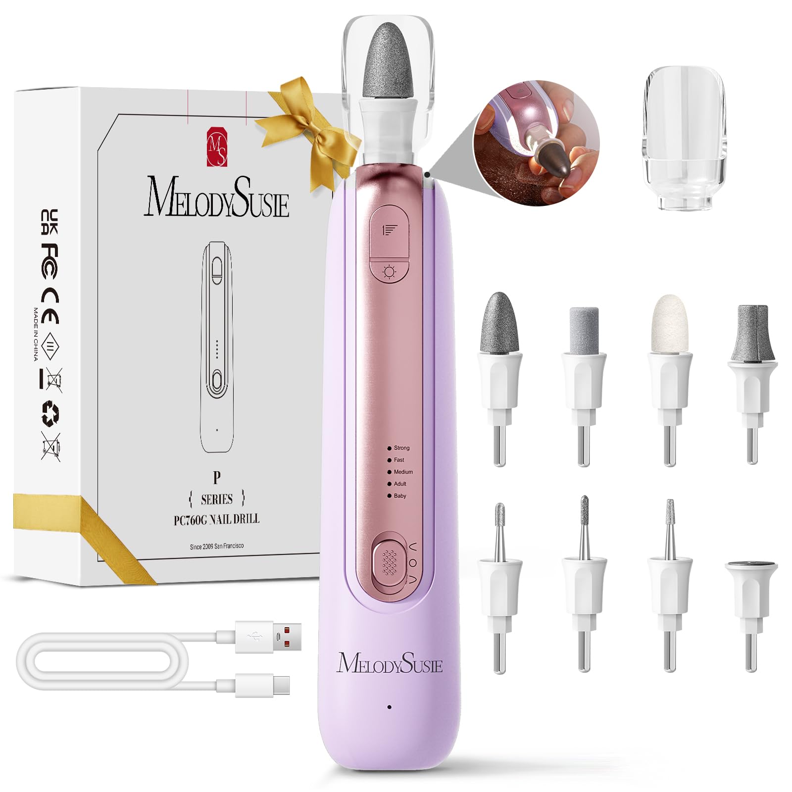8-in-1 Professional Manicure and Pedicure Kit: Experience salon-quality nail care at home with the MelodySusie electric nail drill, featuring 8 versatile drill bits designed to meet all your hand and foot care needs. Effortlessly trim, grind, and polish natural nails, smooth corns and calluses, tackle thick nails and cuticles, or remove acrylic and gel polish. This is a perfect electric nail file kit for women, men, kids, seniors, and even pets, this electric nail file kit is user-friendly for beginners and experts alike. 360° Illumination with Surround LED Light: Our electric nail file features a U-shaped surrounding LED light, providing 360° illumination without dead spots or glare. This thoughtful design ensures a clear view of your grinding area, enhancing efficiency for at-home or salon manicures and pedicures, especially in low-light situations, and is gentle on your eyes. It's also ideal for those with visual impairments and seniors! 5-Speed Settings & Dual Rotations & 10s Memory Modes: Tailor your grooming needs with 5 adjustable speed settings (2200 RPM to 4600 RPM) on this cordless electric nail drill, suitable for the whole family. With user-friendly forward and reverse rotation options, it accommodates both left and right-handed users.Plus, the smart memory mode retains your last used setting for 10s, streamlining your nail care routine for effortless beauty at your fingertips! Cordless & Rechargeable Nail File: Enjoy the freedom of cordless operation with a built-in 2000mAh rechargeable battery, providing up to 6 hours of continuous use after just 2.5 hours of charging. The wireless design allows for convenient hand and foot care anywhere—at home, outdoors, or while traveling, eliminating the hassle of tangled cords. Compact & Portable: This stylish, pen-shaped nail drill is lightweight yet powerful, fitting easily into a backpack, handbag, or pocket for on-the-go convenience. Its ergonomic design minimizes hand fatigue and prevents slipping during use, ensuring a comfortable experience as you achieve professional-quality results from the comfort of your home. Ideal Gift for Loved Ones: This pedicure kit is the perfect gift for anyone who frequently wears high heels, enjoys outdoor activities, or struggles with foot issues. Delight your family and friends with a thoughtful present that suits all skin types and effectively addresses foot problems caused by friction and dryness, allowing their feet to shine confidently in any situation. MelodySusie Professional Manicure Pedicure Kit,PC760G Cordless Electric Nail File Set,8-in-1 Rechargeable Nail Drill with Surround LED Light, 5 Speeds Hand Foot Nail Care Trimmer Buffer Tools