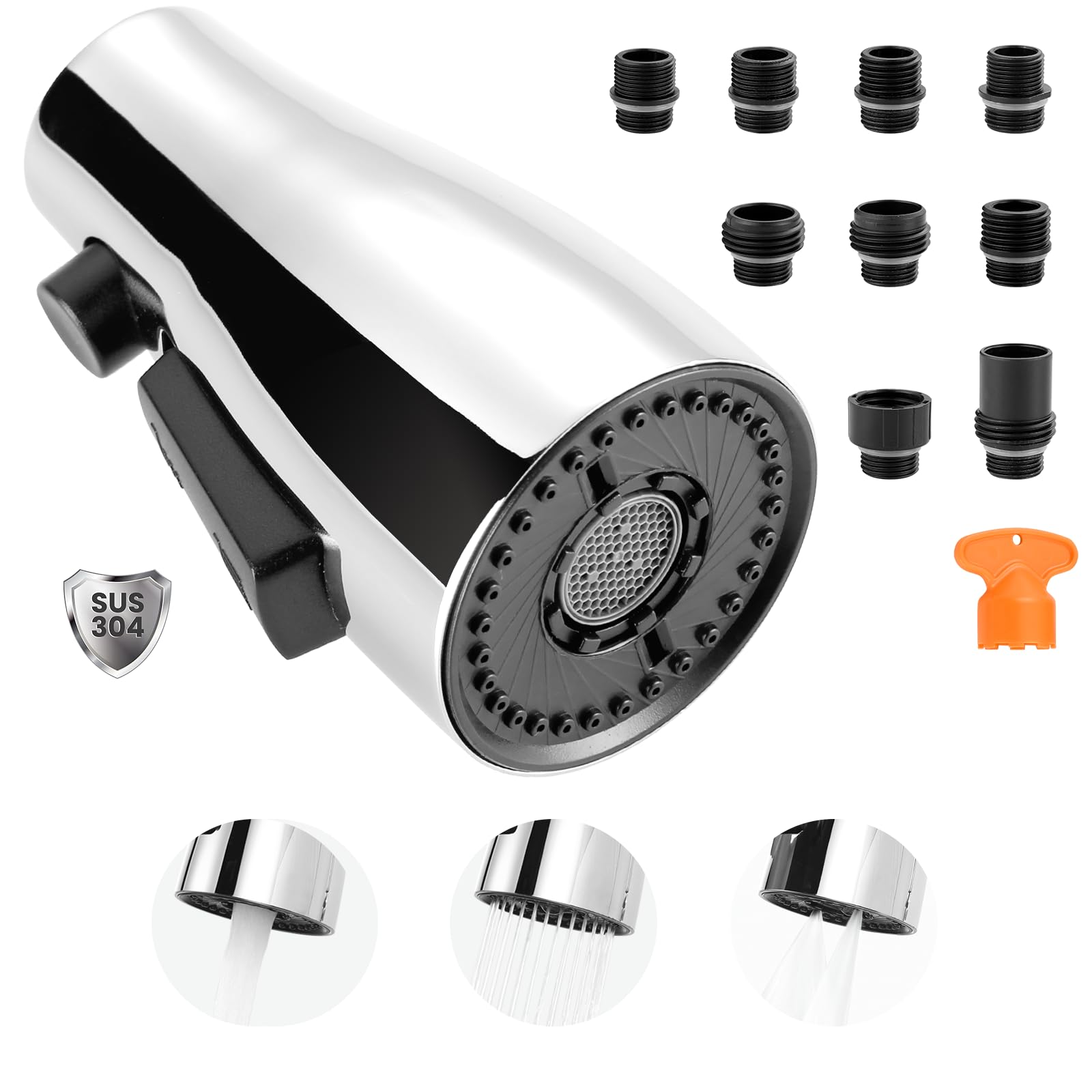 HIGH-QUALITY STAINLESS STEEL MATERIAL: This all-metal pull down faucet head replacement is crafted from high-quality stainless steel, ensuring exceptional durability and rust resistance. The chrome finish features a multi-layer plating process for enhanced fade resistance, keeping your faucet looking great over time SWITCH EASILY BETWEEN 3 MODES: The kitchen faucet head has 3 types of water modes to meet your different cleaning needs. With just the push of a button, switch between stream mode for gentle cleaning, spray mode for everyday rinsing, and a powerful dual sweep mode to quickly remove stubborn food residues from plates 9 CONNECTION SIZES FOR VARIOUS HOSE TYPES: This sink faucet head comes with 9 adapters for a variety of connections and is compatible with major brands of faucet hoses, not limited to compatible with Moen, Delta, American Standard, AquaSource, Hansgrohe and Grohe. Please note only fits most faucets, not all(such as curved shape faucet) REMOVABLE & WASHABLE FAUCET AERATOR: Comes with a free aerator key for removing or replacing the faucet aerator for cleaning. The internal multi-mesh aerator creates a quiet, splash-free stream that filters out impurities, ensuring a steady flow of clean water EASY TO INSTALL: Installing the kitchen faucet head replacement is a breeze—no extra tools required! Simply unscrew the old unit and screw in the new one. With proper installation, you can enjoy a leak-free experience ARCORA Metal Pull Down Spray Head for Kitchen Faucet Upgrade your kitchen with the ARCORA Metal Pull Down Spray Head, compatible with major brands like Moen, Delta, Kohler and American Standard. Crafted from high-quality stainless steel, this all-metal faucet head ensures exceptional durability and rust resistance. The chrome finish features a multi-layer plating process for enhanced fade resistance, keeping your faucet looking pristine over time. Easily switch between three distinct water modes—gentle stream for delicate tasks, spray mode for everyday rinsing, and powerful dual sweep mode to tackle stubborn food residues—with just the push of a button. This versatile faucet head includes 9 connection adapters, making it compatible with various hose types. While it works seamlessly with leading brands, please note that it may not fit all faucet shapes, particularly those with a curved design. Maintenance is a breeze with the removable multi-mesh aerator, which can be easily cleaned using the included aerator key. This feature ensures a quiet, splash-free stream while filtering out impurities for clean water flow. Installation is hassle-free; simply unscrew your old faucet head and screw in the new one—no extra tools required. Enjoy a leak-free experience and elevate your kitchen functionality with the ARCORA Metal Pull Down Spray Head, where style meets practicality!
