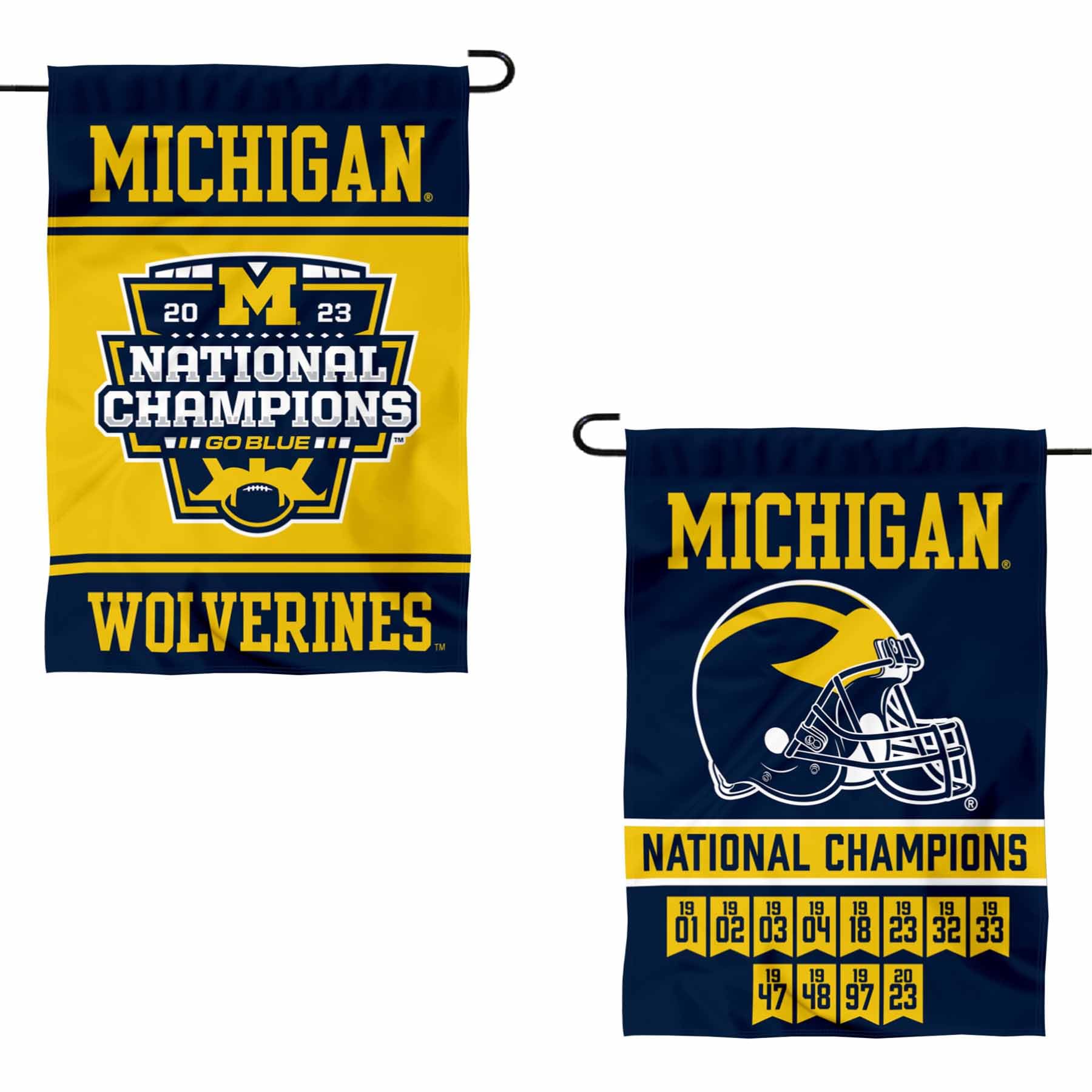 13 in x 18 in in Size with Top Pole Sleeve for hanging from your Garden Stand (Garden Stand Sold Separately) Made of Double Sided 2-Ply 100% Polyester with Sewn-In Liner, Double Stitched Perimeter Sewing, Imported Championship, National Champs, and Game Logos are Screen Printed and Viewable and Readable Correctly on Both Sides Ideal for your Garden, Window, Front Entrance, or as a Small Banner College, University, and Event Logos are Officially Licensed and Team Approved Ideal for your garden or home entrance is our garden banner flag. This double sided garden yard flag measures a large 13 in x 18 in, has a Double Stitched border, a 1 inch top sleeve, and is made of 2 ply Polyester so the logos are Viewable and Readable Correctly on Both Sides. The Screen Printed Michigan Team University Wolverines logos are Officially Licensed and Team, College, or University Approved approved. (Flag Only, Garden Stand and Accessories Sold Separately)