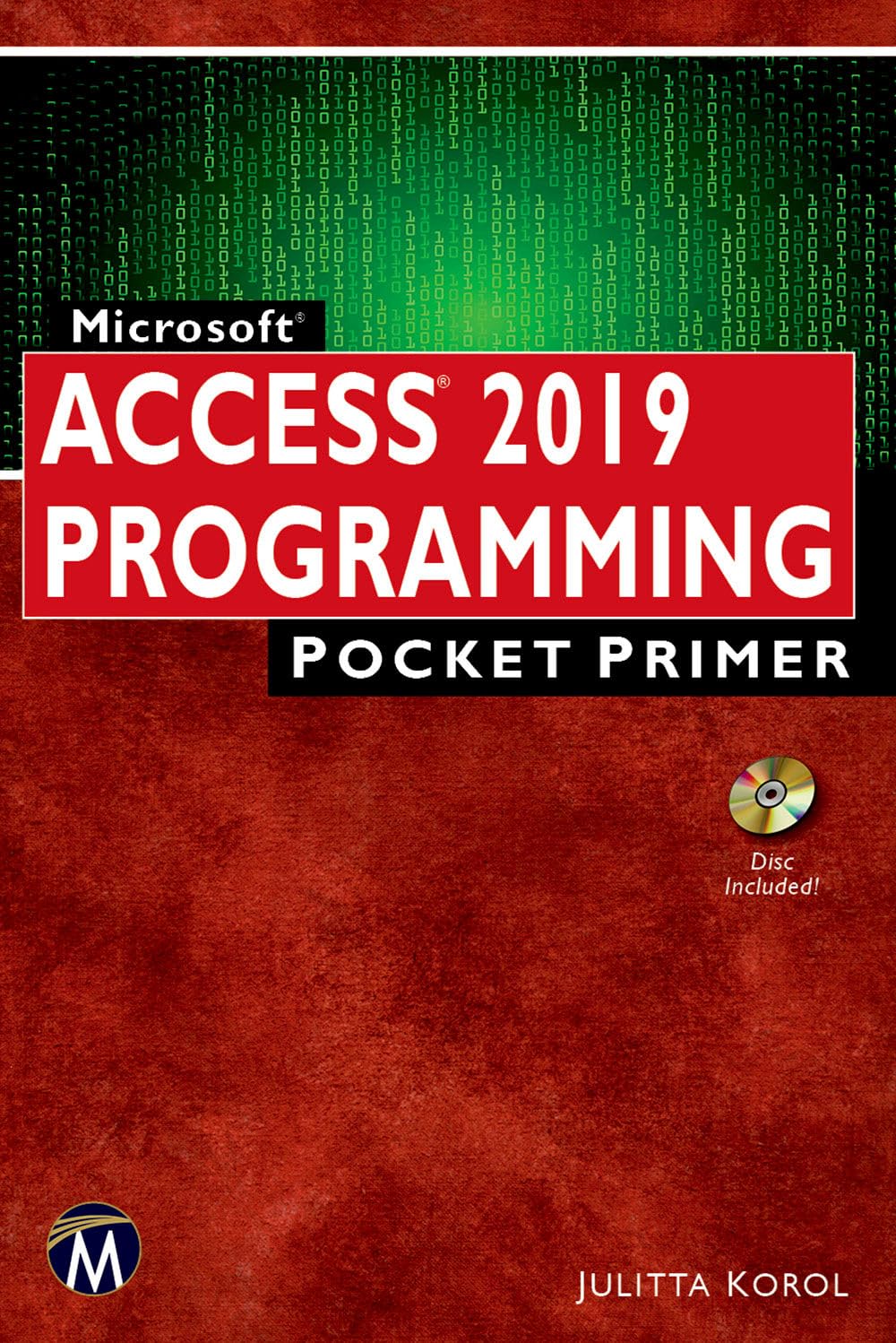 This book was designed for someone like you who needs to master Access programming fundamentals without spending too much time. All you need is a short book to get you started. It will show you only the things you need to know to feel at home with VBA. What you learn in this book on Access programming will also apply to, say, Excel programming. The book is divided into nine chapters that progressively introduce you to programming Microsoft Access 2019. Features: Includes a companion disc with all of the “Hands-On” files needed to complete the chapter projects and all the images from the text (also available from the publisher by emailing info@merclearning.com) - Introduces you to programming Microsoft Access 2019 Korol Julitta : Since 1993, Julitta Korol has published two dozen computer books on using and programming Microsoft Excel and Microsoft Access. She has completed professional certifications by Microsoft Corporation and the Computing Technology Industry Association (CompTIA).