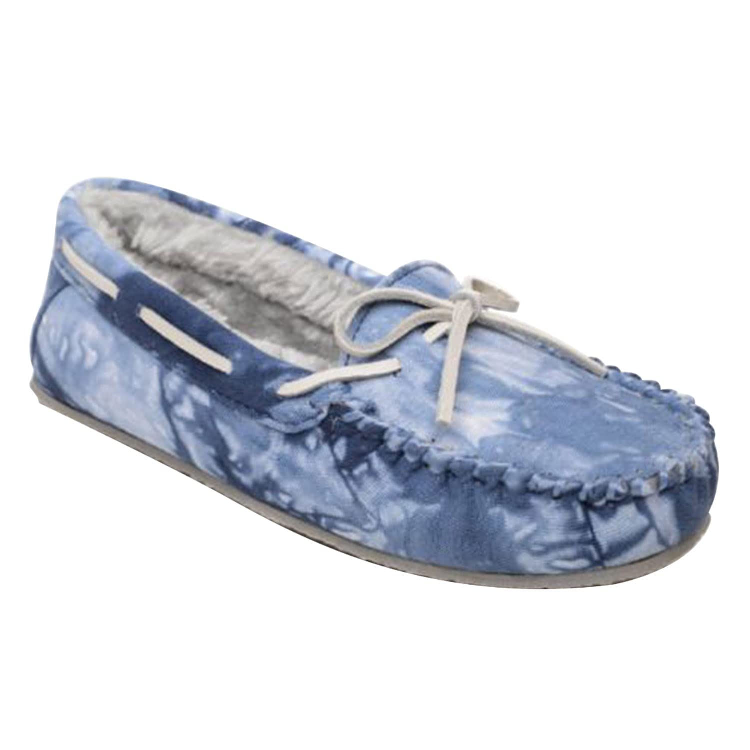 The Minnetonka Women's Tie-Dye Carrie Moccasin Slippers feature a classic moccasin silhouette and are made from durable fabric and plush pile lining.