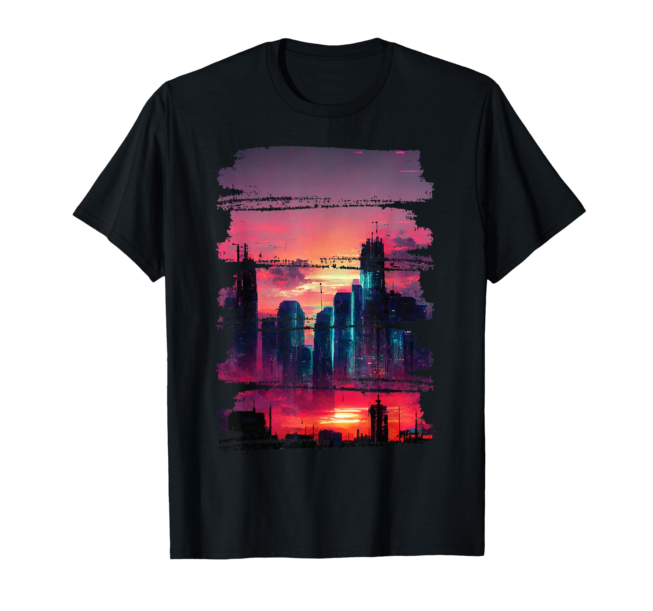 Cyberpunk design. This Japanese streetwear themed design depicts a futuristic city skyline with a cyberpunk or vaporwave aesthetic. Perfect for anyone who loves aesthetic clothing, Tokyo, Japanese streetwear, or cyberpunk art! Lightweight, Classic fit, Double-needle sleeve and bottom hem