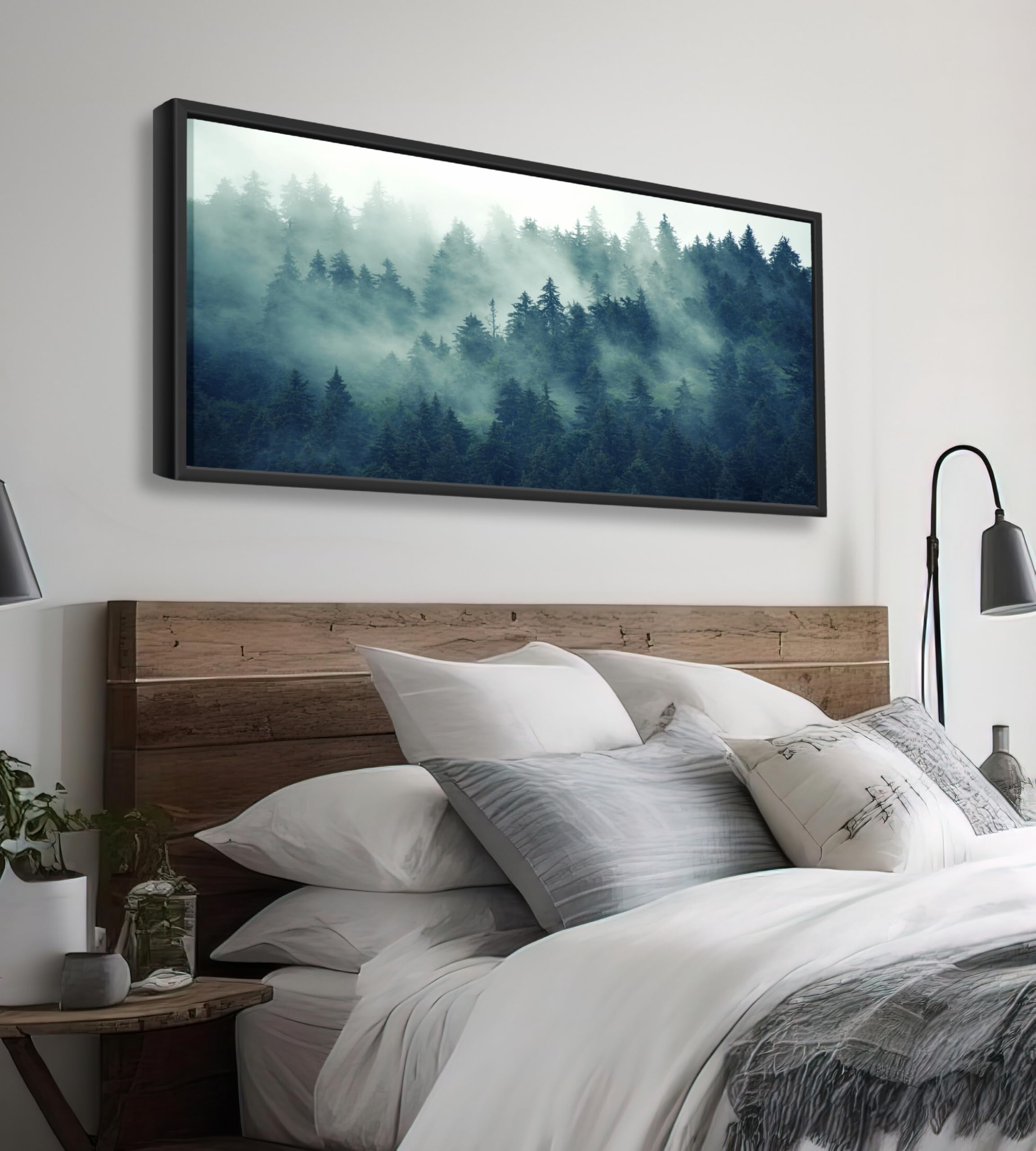 GET READY TO fall in love with our beautiful panoramic dark forest wall art with fog; With gorgeous, vibrant colors and stunning black frame, this foggy trees and nature wall art will add a modern and elegant charm to your home or office. WE KNOW THE LAST THING YOU NEED IS to receive something other than what you see and want; All of our canvas art is printed on high quality premium canvas with high resolution and vibrant colors (not pixelated), STRETCHED perfectly so there are no waves in the canvas or an uneven image. Beautifully framed, shrink wrapped and packed in a carton box to ensure your new wall art stays in PERFECT CONDITION all the way to your door; SIMPLE SET UP? THE ANSWER IS yes- so you can spend time on what matters. Hooks are pre-attached so that your new art is ready to hang! Hanging your new mountain scenery wall art will take only a few minutes. PICTURE PERFECT IN EVERY ROOM - Our forest wall art decor painting measures 24" x 48" (1 horizontal panel with black frame) and is the perfect piece for any home or indoor space - especially the kitchen, bedroom, living room, dining room, office as well as above a fireplace, desk, TV, bed or couch; Our sets make a wonderful wedding, holiday or house warming gift for both men and women who love the outdoors and Northwest!