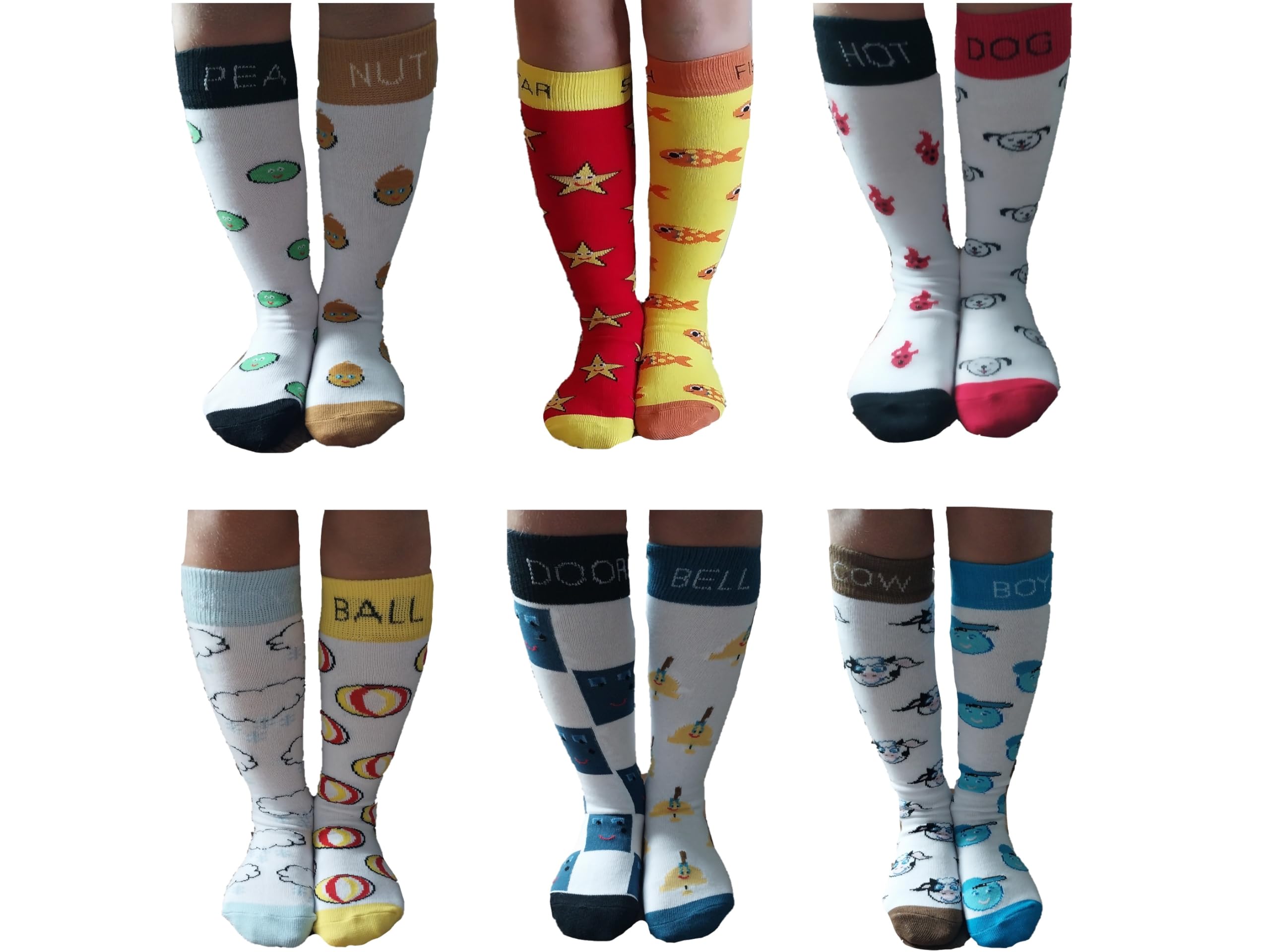 Learn & Grow from Head to Toe: Every step builds creativity and confidence as kids mix and match 6 playful compound word sets like Cowboy, Peanut, Starfish, Snowball, Hotdog, & Doorbell for a fun, hands-on way to dive into language learning Be Different, Be the Opposite, Be You: Empower young dreamers to proudly express their bold, creative spirit with vibrant, mismatched socks that celebrate their individuality, self-expression, and free-thinking fun every single day Built for Busy Bodies & Bright Minds: Crafted with a reinforced cuff, heel, and toe, these durable socks stay secure and comfy through every wild adventure, challenging activity, and spontaneous leap of imagination All-Day Softness & Stretchy Comfort: Our soft, breathable blend of 80% cotton, 17% spandex, and 3% nylon delivers lightweight, cozy comfort with just the right amount of stretch to keep up with every move and moment Easy Care for Daily Wear: Fade-resistant and machine washable, these crazy, funny, and fabulous novelty socks are perfect for everyday wear, travel, Halloween costumes, school days, and any time kids want to flaunt their unique style *** Satisfy Their Yearning for Learning ***