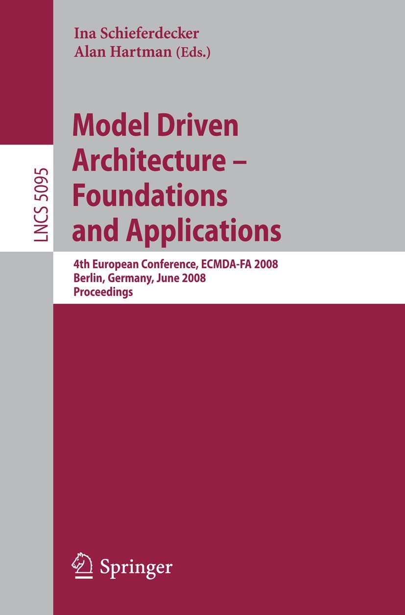 The fourth edition of the European Conference on Model-Driven Architecture – Foundations and Applications (ECMDA-FA 2008) was dedicated to furthering the state of knowledge and fostering the industrialization of the model-driven architecture (MDA) methodology. MDA is an initiative proposed by the - ject Management Group (OMG) for platform-generic software development. It promotes the use of models in the speci?cation, design, analysis, synthesis, - ployment, and evolution of complex software systems. ECMDA-FA 2008 focused on engaging key European and international - searchers and practitioners in a dialogue which will result in a stronger, more e?cientindustry,producingmorereliablesoftwareonthebasisofstate-of-the-art research results. ECMDA-FA is a forum for exchanging information, discussing the latest results and arguing about future developments of MDA. It is a pleasure to be able to introduce the proceedings of ECMDA-FA 2008. ECMDA-FA addresses various MDA areas including model management, e- cutable models, concrete syntaxes, aspects and concerns, validation and te- ing, model-based systems engineering, model-driven development and servi- oriented architectures, and the application of model-driven development. Therearesomanypeople whodeservewarmthanksandgratitude.The fru- ful collaboration of the Organization, Steering and Program Committee m- bersandthevibrantcommunityledtoasuccessfulconference:ECMDA-FA2008 obtainedexcellentresultsintermsofsubmissions,programsize,andattendance. The Program Committee accepted, with the help of additional reviewers, research papers and industry papers for ECMDA-FA 2008: We received 87 s- missions. Of these, a total of 31 were accepted including 21 research papers and 10 industry papers. We thank them for the thorough andhigh-quality selection process. This book constitutes the refereed proceedings of the 4th European Conference on Model Driven Architecture - Foundations and Applications, ECMDA-FA 2008, held in Berlin, Germany, in June 2008. The 31 revised full papers presented - 21 research papers and 10 industry papers - were carefully reviewed and selected from 87 submissions. The papers address all current issues of model-driven architecture, i.e. model management, executable models, concrete syntaxes, aspects, and concerns, validation and testing, model-based systems engineering, model-driven development and service-oriented architectures, and the application of model-driven development. The papers are organized in topical sections on model management, executable models, concrete syntaxes, aspects and concerns, validation and testing, model-based systems engineering, model-driven development and service-oriented architectures, as well as surveys on applying model-driven development.