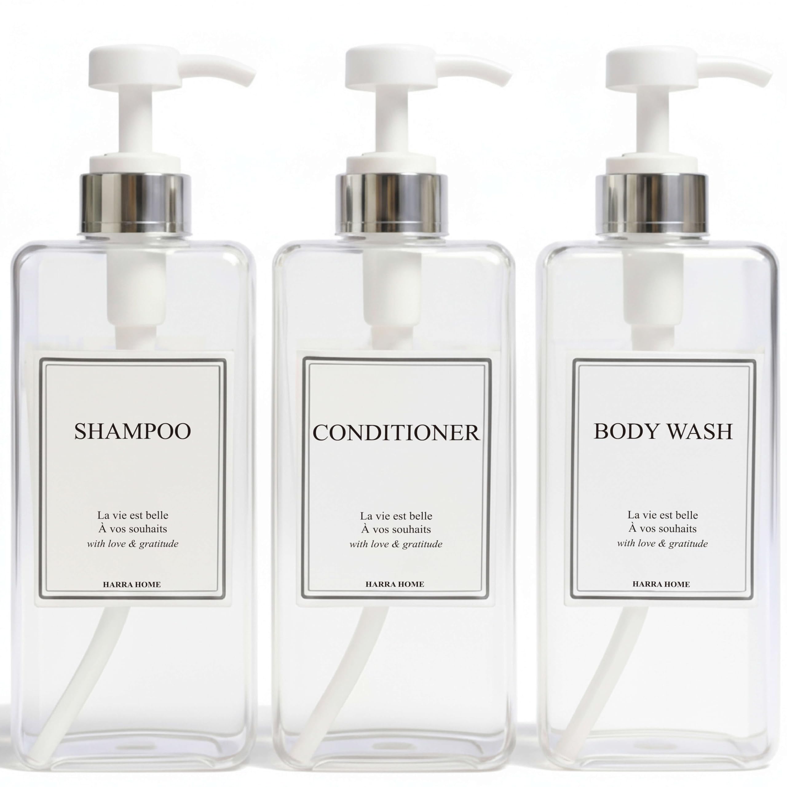 INSTANTLY UPGRADE TO 5-STAR LUXURY - Turn clutter into a spa sanctuary in seconds. Our 27oz large square shampoo dispenser set is the fastest way to achieve a seamless, high-end aesthetic in your bathroom. Whether your style is Modern, Minimalist, or Farmhouse, this is the simple upgrade that makes your space look luxurious instantly. GENEROUS 27 OZ CAPACITY & CHECK YOUR FIT FIRST — The generous 27 oz capacity is ideal for family bathrooms, guest baths, or kitchen. Bottles arrive empty - liquids not included. Pump unlocked height: 9.5 inches (24 cm). Refillable empty bottles size (per bottle), pump locked: 8.5 inches H × 2.8 inches W × 2.8 inches D. Minimum shelf clearance: ≥ 9.5 inches (24 cm). ELEGANT & MODERN DESIGN — Elevate your bathroom decor with HARRA HOME bathroom accessories that create an instant hotel-style bathroom aesthetic. These decorative pump dispensers transform any shower and sink area into a modern bathroom sanctuary without breaking the budget. Perfect bathroom organizers that eliminate clutter from multiple bottles while adding elegance to your space. VERSATILE WITH WATER-RESISTANT LABELS — Perfect for dispensing any liquid soap, hand soap, dish soap, DIY lotion, hand sanitizer, baby wash, shampoo, conditioner, hand wash in your bathroom and kitchen sink. Includes 6 water-resistant stickers to easily identify contents - helping you organize your essentials with style. PERFECT GIFT IDEA — HARRA HOME bathroom countertop soap dispensers make memorable housewarming gifts, apartment warming presents, and beautiful gift sets for new homebuyers, guest houses, and shared living spaces. Create a practical and elegant gift that truly stands out.