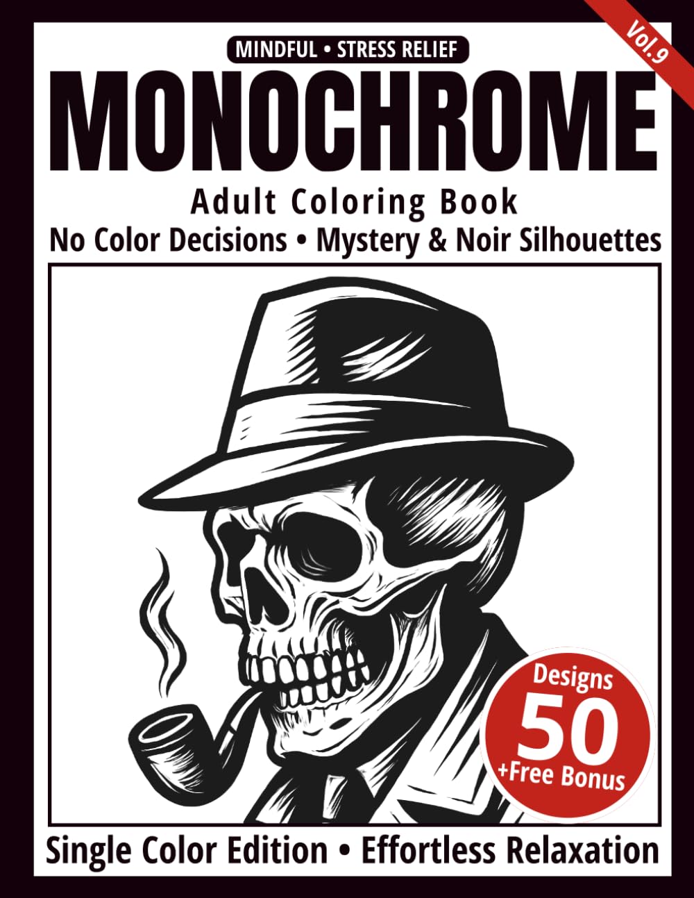 Do you crave mystery, noir, and the thrill of the unknown—but struggle to find a coloring book that actually delivers that atmosphere? Most coloring books are packed with flowers, mandalas, or abstract patterns. Pretty, yes—but they don’t spark tension, suspense, or intrigue. Worse, too many colors, complicated details, and messy bleed-through can turn what should be relaxing into something frustrating. Step Into the Shadows with a Pen in Hand The Monochrome Adult Coloring Book: Mystery & Noir changes everything. With 50 linocut-style silhouettes in bold black and white, you’ll enter a shadowy world of detectives, masks, daggers, ravens, skulls, and eerie objects. You don’t need dozens of markers or a full palette. Just one pen is enough to bring chilling designs to life—stress-free, bold, and unforgettable. WHAT YOU’LL LOVE INSIDE 50 UNIQUE MYSTERY DESIGNS – From detectives and skulls to keys, ravens, and daggers. Each page pulls you into an atmosphere of suspense. - SINGLE-COLOR FORMAT – Forget the stress of palettes. One pen delivers powerful, dramatic results. - BLACK-BACKED PAGES – Prevents bleed-through and keeps your finished artwork clean and safe. - REMOVABLE BLACK INSERT PAGE – Use it as a shield for markers, pens, or gel pens. - LARGE 8.5” x 11” SIZE – Spacious, comfortable designs for a satisfying coloring experience. WHY THIS BOOK STANDS OUT Unlike ordinary coloring books, this volume is crafted specifically for mystery and noir lovers. Every silhouette drips with atmosphere: foggy alleys, ominous objects, haunting shadows. It’s more than coloring—it’s an escape into a darker, cinematic world. PICTURE THIS After a long day, you sit down, take a single pen, and let the shadows unfold. The detective’s fedora. The raven’s feathers. The dagger’s glint. Each stroke pulls you deeper into a story only you can finish—calm meets curiosity, focus meets fascination. READY TO DIVE DEEPER? Don’t settle for the ordinary. Add the Monochrome Adult Coloring Book: Mystery & Noir to your cart today and unlock a stress-free way to relax while exploring a world of suspense, symbols, and unforgettable noir style. 👉 Special Bonus Included: Every purchase comes with exclusive access to a digital sampler featuring coloring pages from across the Monochrome series—so your creative journey goes even further.