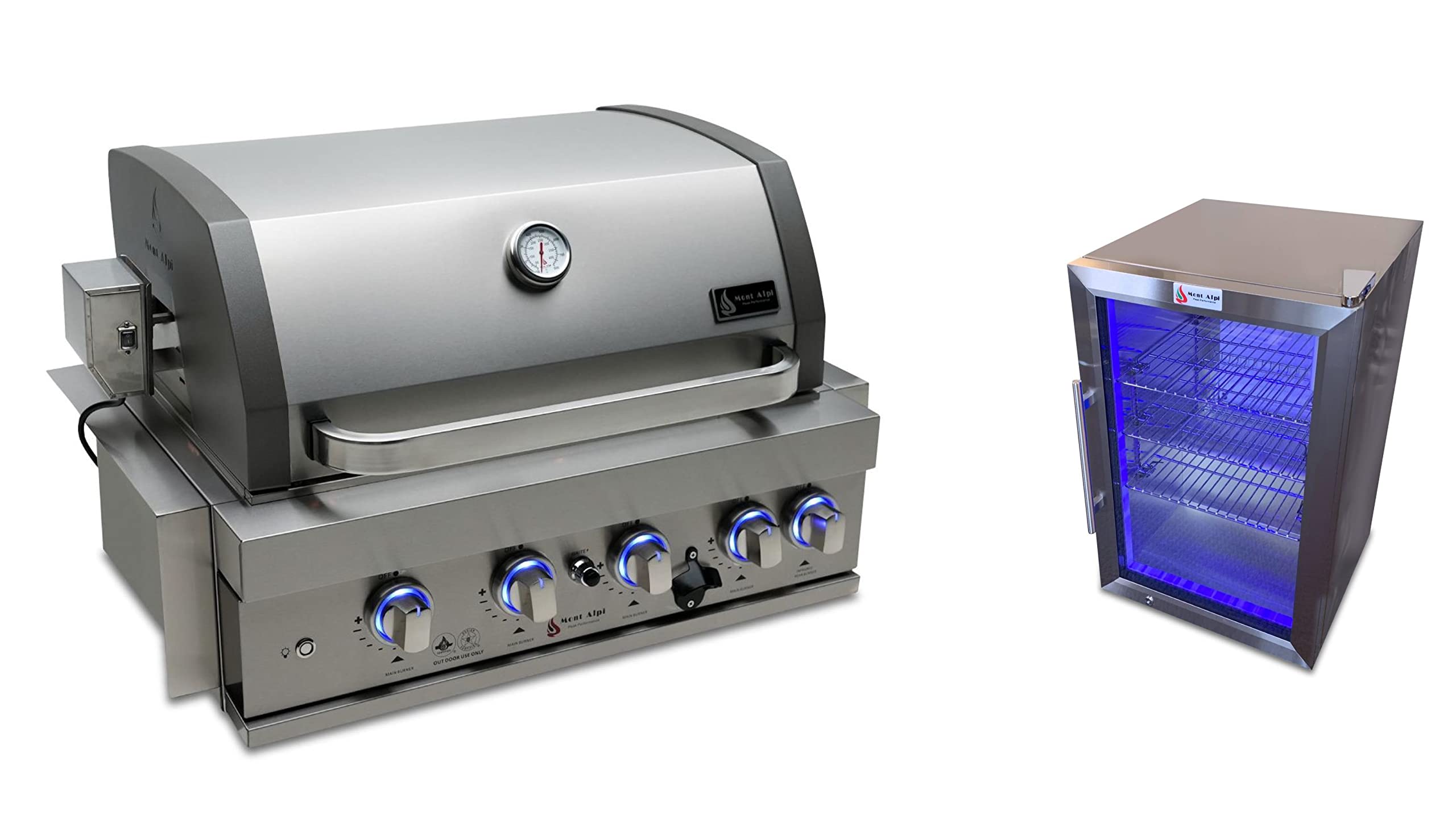 BUILT-IN FEATURES - The MABi400 32-inch island gas grill arrives fully assembled and features 4 tubular stainless steel high efficiency burners with a rear height-adjustable ceramic infrared burner that produces a whopping 63,000 BTU’s of heat output. The grill also features a stainless steel warming rack, 8mm stainless steel cooking grids and a generous cooking area of 28-inches x 18-inches (792 square Inches of total cooking area). ADDITIONAL FEATURES - A double lined grill hood with temperature gauge is standard for maximum heat retention. The grill has two cooking surface halogen lights, On/off red/blue changing control knob lights, a bottle opener, electronic ignition, and easy access full front pull-out grease tray for easy cleaning. You will also get a 120V 4 Watt heavy duty electric motor rotisserie kit (holds up to 25 lbs) and a waterproof outdoor rated weather cover to protect your grill from the elements. INCLUDED ACCESSORIES - You will also get a 120V 4-Watt heavy duty electric motor rotisserie kit (holds up to 25 lbs), chopping board, white granite surfaces and waterfall side plus a waterproof outdoor rated weather cover to protect your grill from the elements. This combo will also include a griddle plate (MAGR) and charcoal tray (MACT) NATURAL GAS CONVERTIBLE - Although this grill comes with a propane hose and regulator as it comes ready for propane use, it can be easily set up for conversion into the more environmental-friendly natural gas, providing another convenient cost-effective, and reliable source of heat for outdoor cooking. (Conversion kit sold separately) STAINLESS STEEL CONSTRUCTION - This modular outdoor kitchen is made of 304 marine grade stainless steel, a high-quality material that is known for its durability & resistance to corrosion & rust that also adds sleek, modern, and stylish addition to your backyard or patio. High, consistent heat output are made possible by the stainless steel burners, allowing you to cook a variety of food and meals with ease. The stainless steel components also make the grill easy to clean and maintain. REFRIGERATOR FEATURES - The outdoor rated MAF refrigerator is made with heavy duty 304 stainless steel construction for durability and resistance to the elements. It comes with a stylish glass door for easy viewing of contents and interior blue lighting as well to improve visibility and overall user experience. Additional features include temperature control, adjustable shelves, and a lockable door to secure contents and prevent unauthorized access. Dimensions - 18 1/2” x 17” x 27” LIMITED LIFETIME WARRANTY - Mont Alpi grills are designed and built to last and we stand behind their performance. As a demonstration of commitment to our customers and their satisfaction, we offer a limited lifetime warranty (limitations apply) on all our products. Please do not hesitate to reach out to us If you have any questions or concerns regarding our products. We are here to help. PRODUCT DIMENSIONS - Height (hood closed) - 21”. Height (hood open) - 35”. Depth -23”, Width - 31 1/2”. Rotisserie kit length - 32”. Refrigerator Height - 27". Width - 17". Depth - 18.5". All components are constructed of 304 stainless steel for durability and longevity Four, 12,000 BTU burners for plenty of grilling power Double layered Heatwave flame tamers provide even heat distribution Control knob lights are blue when burner if off and red when burner is lit Arrives fully assembled The 400 Built-In Gas Grill features an all 304 stainless steel construction for corrosion resistance and durability. The lid is double lined for superb heat retention and has a temperature gauge on front. The main cooking area measures 30 x 18 inches, and consists of 8mm stainless steel cooking grids. A stainless steel warming rack is also standard. Beneath the cooking surface are 4 double layered stainless steel Heatwave flame tamers that provide even heat distribution and protect the 4 tubular stainless steel high-efficiency 12,000 BTU burners that sit below them. In the rear of the grill is a ceramic infrared burner for the included heavy duty rotisserie kit. The interior of the grill is lit by dual halogen lights, perfect for cooking after dark. The front control panel houses the control knobs, lit by blue light, the electronic ignition switch, and a bottle opener for having a drink while tending the grill. The pull-out grease tray makes cleaning up after an afternoon of barbecuing a snap. An all-weather cover is included to protect the grill from the outdoor elements when not in use.