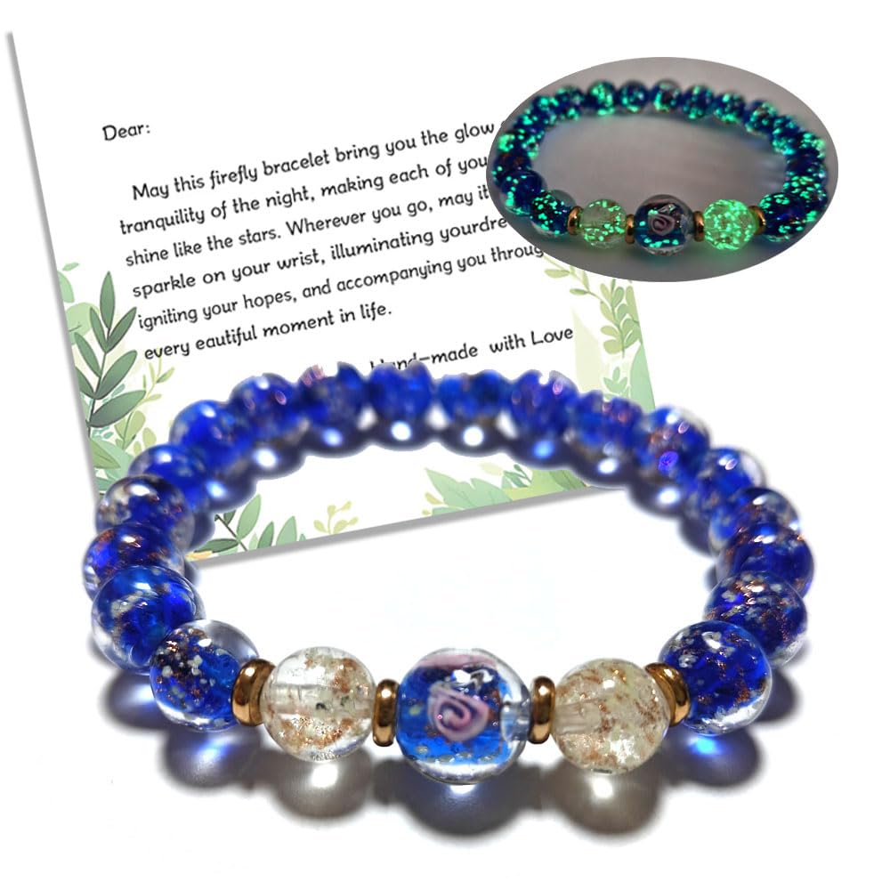 Self-luminous night glow effect (no battery required) Made of light energy absorbing materials, it can store light under daily lighting or sunlight and emit a soft glow at night, adding a unique highlight to your outfit. Handmade Craftsmanship with a Unique Texture Each bracelet is carefully hand-strung. The beads are smooth and refined, offering a comfortable wearing experience suitable for both day and night activities. Versatile Style for Multiple Occasions Perfect for parties, night gatherings, music festivals, holiday events, or everyday outfits—easy to match and adds a luminous touch to any style. Adjustable Fit for Most Wrists Crafted with a stretch cord that naturally conforms to the wrist, making it easy to wear and suitable for most users. Gift-Ready Packaging Comes with simple gift packaging, making it an ideal choice for birthdays, holidays, party favors, or any special surprise for someone you care about. This luminous beaded bracelet is a unique handmade accessory. It is made of luminous glass beads and gives off beautiful light in the dark. Beads are arranged on an elastic rope, and the bracelet can be stretched and folded, making it comfortable to wear. Each bead is carefully placed by hand, giving the bracelet artistic charm. Wearing this bracelet is like a small firefly around your wrist. Its soft green light creates a magical appearance in low light conditions. This multifunctional bracelet is a thoughtful gift for women, teenagers or anyone who wants to find whimsy in the closet. The width is less than 7/8 inch, which is suitable for most adults to use its elastic structure to ensure that it can maintain a comfortable fit regardless of activity or rest.