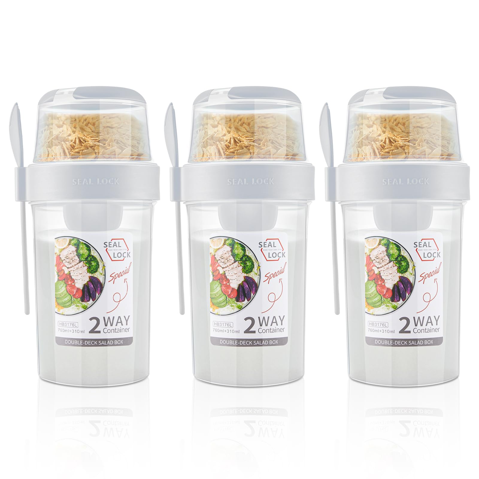What You Receive: package includes 3 pieces of salad shaker cups mainly in white, each is equipped with 1 fork, 1 lid and 1 salad dressing holder, sufficient quantity with available accessories for you to use in daily life Safe and Leakproof: these salad meal shakers are made of PP plastic material with silicone sealing ring, which are safe and reliable to use, leakproof and reusable, sturdy and easy to clean, lightweight and portable to carry; With a transparent cup body, you can clearly see inside content Double Layer and Large Capacity: the salad shaker container is designed with double layers, the upper layer is approx. 10.5 oz/ 310 ml for fruit and the lower layer is approx. 25.7 oz/ 760 ml for salad, thus you can shake the different food together when you want, ensuring a fresh taste of your salad Widely Fit: the salad cups with lids and fork with a large capacity are suitable for holding a variety of food, such as fruit, vegetable, cereals, nuts, strawberries, blueberries, milk, yogurt, etc.; They are ideal supplies for office workers, students, business people and people who are keeping fit Suitable Occasions: the keep fit fresh salad cup is suitable for various occasions, such as office, school, travel or picnic, home, classroom, dorm, BBQ, and more, which will be a practical and thoughtful gift for birthdays, holidays, anniversaries, and more Features: The salad container for lunch with dressing cup is a carefully chosen gift for your family, friends, neighbors, classmates, colleagues and other people you care for, add more convenience to their daily life. The salad shaker cup is approx. 4.1 inches/ 10.5 cm in diameter and 8.5 inches/ 21.5 cm in height, compact and portable for you to carry with, so you can put it in your handbag, shoulder bag, tote or other places, allowing you to enjoy fresh salad meals anytime and anywhere. Specifications: Material: PP plastic, silicone sealing ring Color: mainly white Size: approx. 4.1 inches/ 10.5 cm in diameter and 8.5 inches/ 21.5 cm in height Capacity: approx. 25.7 oz/ 760 ml plus 10.5 oz/ 310 ml Package includes: 3 Pieces of salad shaker cups Notes: Manual measurement, please allow slight errors on size. The color may exist a slight difference due to different screen displays.