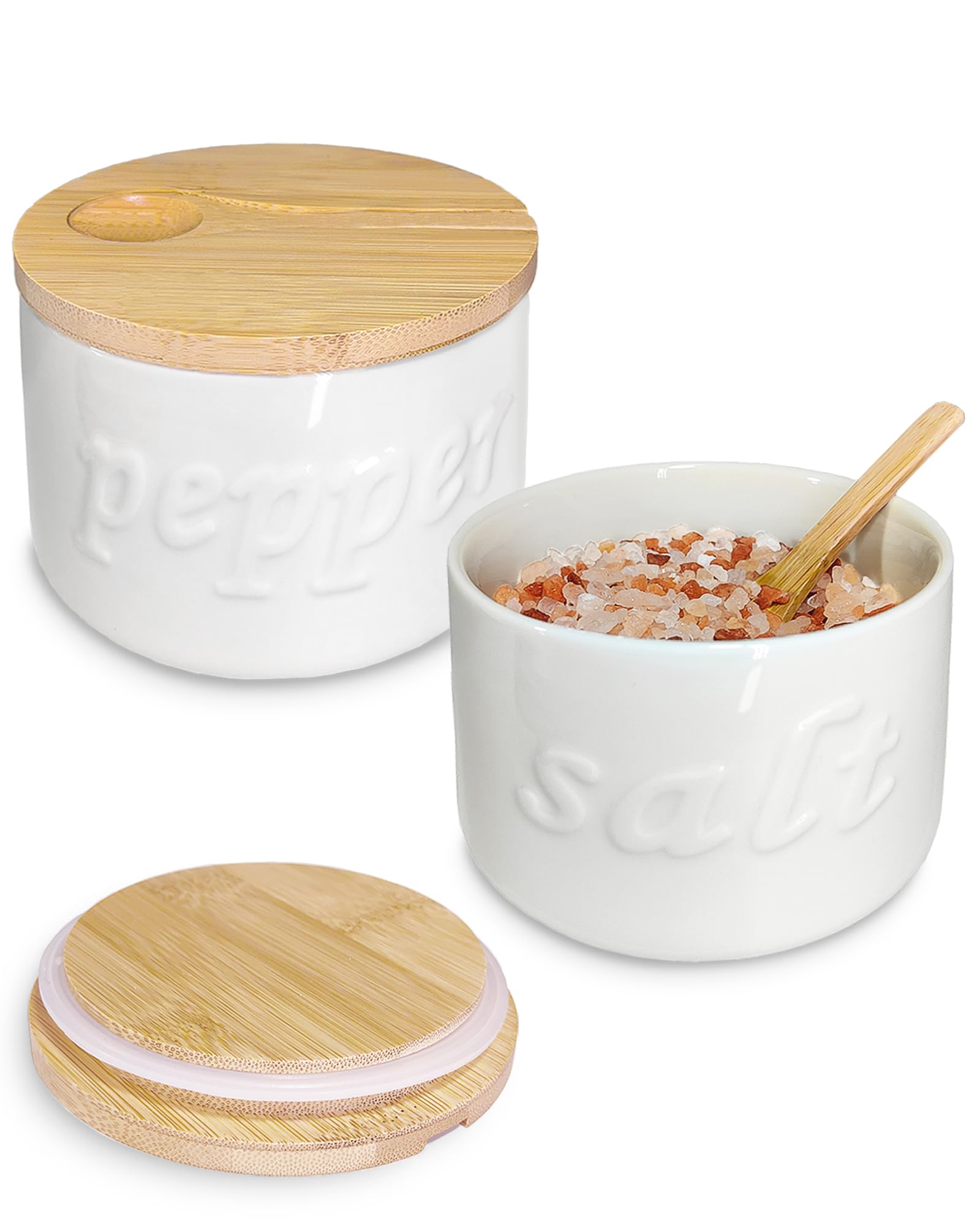 Airtight: The combination of a bamboo lid and a sealing ring, paired with the ceramic salt jar, effectively blocks moisture in the air. This ensures that salt and pepper remain dry and fresh Practicality: Each container in the salt and pepper holder set has a large capacity of 16 ounces, easily meeting daily household needs. The grooved design of the bamboo lid is used to hold a spoon, allowing for easy access at any time. This salt holder serves as an excellent helper for kitchen cooking and outdoor BBQ Unique Style: This ceramic salt and pepper containers features a strong farmhouse style. Placed in kitchens or on counters with various design styles—such as modern, pastoral, or rural—it combines practicality and aesthetics seamlessly Embossed Text Labels: The salt and pepper cellar with lid features embossed text with raised "Salt" and "Pepper" logo on its body, eliminating the need for additional label stickers. This embossed design allows for quick recognition, remains permanently legible without fear of erasure, and embodies a modern minimalist aesthetic Versatile Usage: Beyond storing salt and pepper, the ceramic salt dish can be used to hold coffee, seasonings, sugar, tea, spices, and more. Their stackable design helps save countertop space, making them a practical solution for organizing various kitchen essentials efficiently salt and pepper bowl