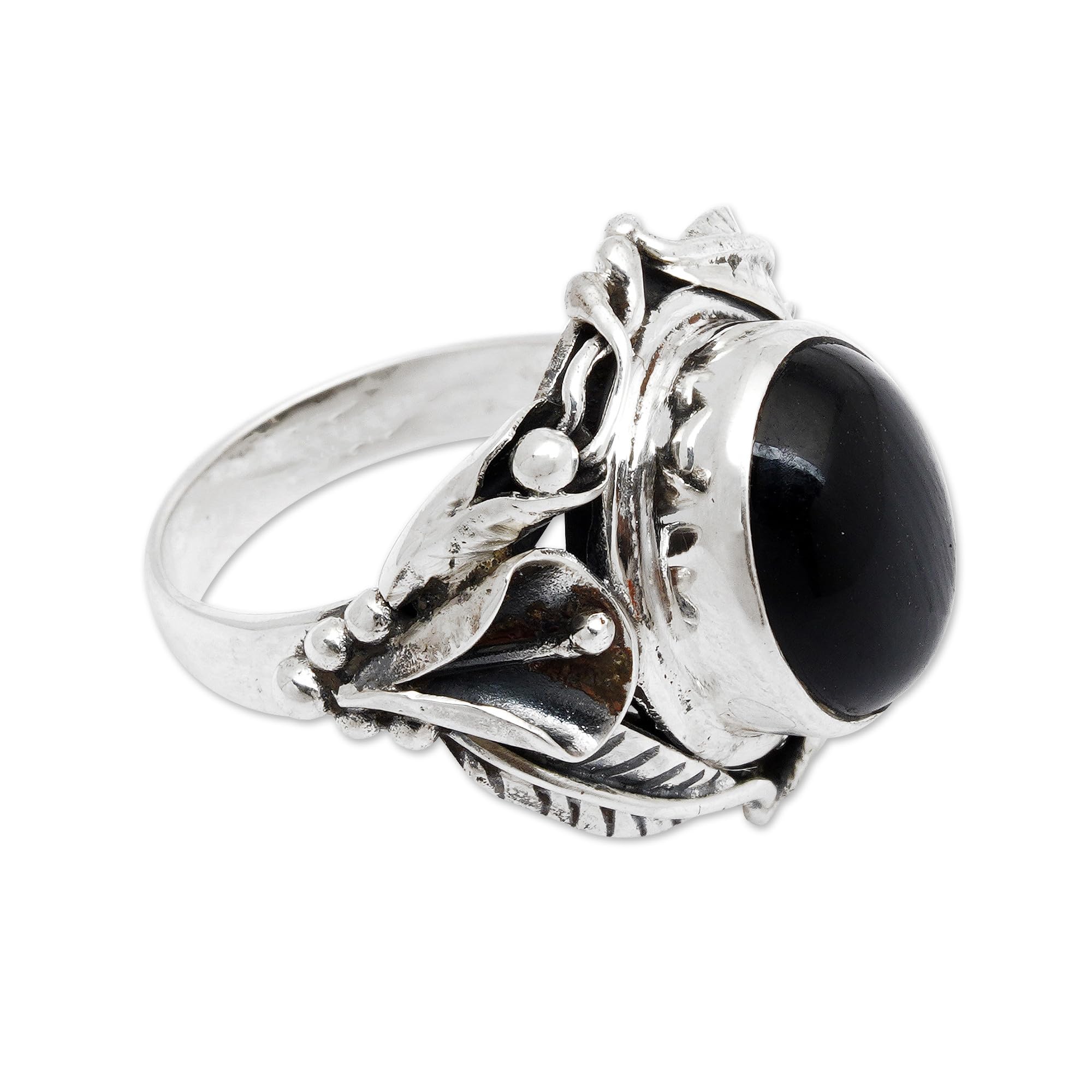 About this item: Black onyx rests in a bed of calla lilies with tantalizing beauty. Buana designs the original ring for women, which is crafted in sterling silver with florid detail.