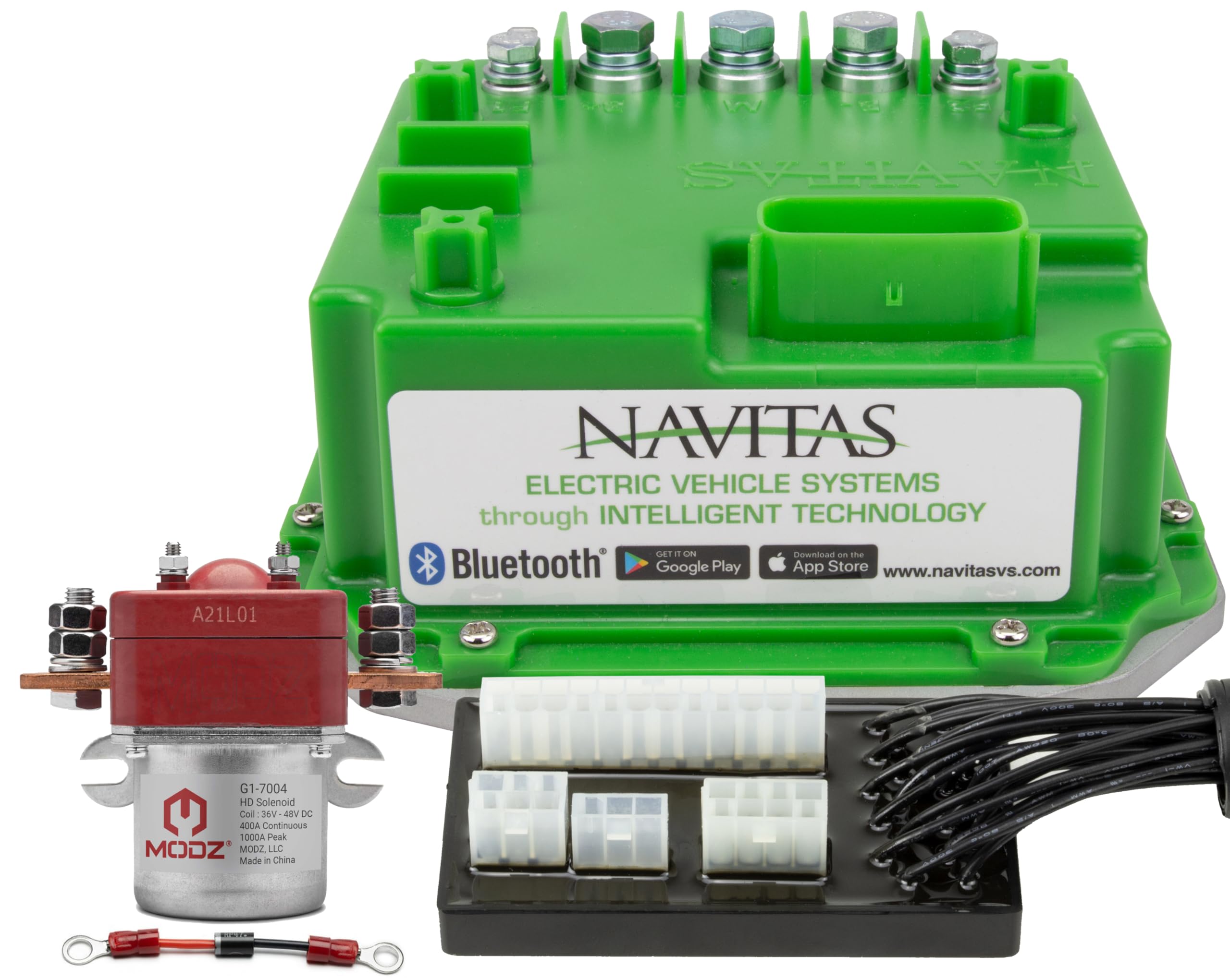 Kit includes: (1) Navitas 600-Amp Controller, Plug and Play 16-Pin harness and MODZ Heavy Duty Solenoid with Diode for Club Car DS with Curtis OEM SepX 1268/1520 Controller Golf Carts Performance: Cost effective replacement to increase power of your golf cart. Speeds up to 23MPH with stock 18" wheels and tires. Improved efficiency at lower speeds = More Range Bluetooth App: The Navitas app allows you to monitor the vehicles performance. Built in speedometer. Gear indicator (Forward, Reverse, Neutral). One-click Car lockout feature. Live battery voltage monitoring. Provides alerts that you can send directly to us or technician/dealer for diagnostics. Features: Compact size and extremely lightweight. Cost effective replacement to increase the speed and power of your golf cart. Motor over-speed protection is ensured using the motor field. MODZ Heavy Duty Solenoid and Diode Included: The solenoid is responsible for managing high amperage loads between your golf cart controller and batteries. A heavy duty solenoid is required when upgrading to high amperage controller. Navitas 600-Amp Club Car DS with Curtis OEM SepX 1268/1520 Golf Cart Controller Kit and MODZ Heavy Duty Solenoid with Diode