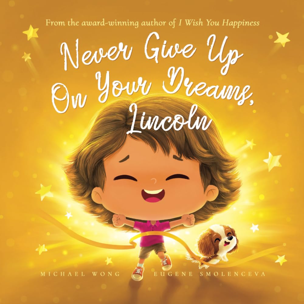 From the award-winning author of I Wish You Happiness and I Will Always Be Proud of You comes an inspiring children's picture book about never giving up on your dreams. " A superbly illustrated picturebook packed full of tips to help children grow up to be anything they want to be. Highly recommended! " (5-Star Review) — A 'Wishing Shelf' Book Review " Never Give Up On Your Dreams is a stunningly illustrated and thoughtfully written book " (5-Star Review) — David Korson, Readers' Favorite Never Give Up On Your Dreams, Lincoln , empowers your child or grandchild with the grit, resilience, and perseverance to never give up on their dreams in a beautiful, inspiring picture book. Show them they have the strength and courage within to achieve all their dreams. “Beautiful,” “perfect,” and “gorgeous” are how reviewers and customers describe this empowering book. Inspire your child with the incredible stories of five famous people who overcame incredible odds to achieve their dreams. Your child will have fun with our trademark "Can You Spot the Famous People?" and "Can You Spot the Dogs" activities. The gorgeous, whimsical illustrations embrace diversity and inclusion to help build a better world for our children. This beautifully illustrated picture book is a wonderful gift, whatever the occasion: birthday, graduation, adoption, or just to say, " I love you ." Never Give Up On Your Dreams is a must-have for your home or school social-emotional library. Join thousands of teachers, grandparents, and parents, and discover why so many love and recommend Michael Wong’s "Unconditional Love Series" of empowering children's picture books. There are 250 Never Give Up On Your Dreams children's books personalized with their name. Search for, " Never Give Up On Your Dreams 'name' " on Amazon.com (Canada, UK, Ireland, Australia, etc.): Aaliyah, Aaron, Abigail, Adalynn, Adam, Addison, Adeline, Adrian, Aiden, Alaia, Alexander, Alice, Allison, Amara, Amelia, Andrew, Anna, Anthony, Aria, Ariana, Ariella, Arthur, Arya, Asher, Athena, Aubrey, Audrey, Aurora, Autumn, Ava, Avery, Axel, Ayla, Beau, Bella, Benjamin, Bennett, Brielle, Brooklyn, Brooks, Caden, Caleb, Cameron, Camila, Caroline, Carson, Carter, Charles, Charlie, Charlotte, Chloe, Christopher, Claire, Clara, Colton, Connor, Cooper, Cora, Daisy, Daniel, David, Declan, Delilah, Dominic, Dylan, Easton, Eden, Eleanor, Elena, Eli, Eliana, Elias, Elijah, Eliza, Elizabeth, Ella, Elliana, Ellie, Eloise, Emery, Emilia, Emily, Emma, Emmett, Enzo, Ethan, Eva, Evelyn, Everett, Everleigh, Everly, Evie, Ezra, Faith, Florence, Freddie, Freya, Gabriel, Gabriella, George, Gianna, Grace, Grayson, Greyson, Hadley, Hailey, Harper, Harry, Hazel, Henry, Hudson, Hunter, Ian, Iris, Isaac, Isabella, Isabelle, Isaiah, Isla, Ivy, Jack, Jackson, Jacob, Jade, James, Jameson, Jaxon, Jaxson, Jayden, Jeremiah, John, Jonah, Jonathan, Jordan, Joseph, Josephine, Joshua, Josiah, Josie, Julia, Julian, Kai, Kayden, Kennedy, Khloe, Kinsley, Landon, Layla, Leah, Leilani, Leo, Leonardo, Levi, Liam, Liliana, Lillian, Lily, Lincoln, Logan, Luca, Lucas, Lucy, Luka, Luke, Luna, Lydia, Lyla, Mackenzie, Madeline, Madelyn, Madison, Maria, Mason, Mateo, Matteo, Matthew, Maverick, Maya, Melody, Mia, Micah, Michael, Mila, Miles, Milo, Myles, Naomi, Natalia, Natalie, Nathan, Nevaeh, Noah, Nolan, Nora, Nova, Oakley, Oliver, Olivia, Oscar, Owen, Paisley, Parker, Penelope, Peyton, Piper, Poppy, Quinn, Reese, Remi, Riley, River, Roman, Rose, Rosie, Rowan, Ruby, Ryan, Ryder, Rylee, Sadie, Samuel, Santiago, Sarah, Savannah, Scarlett, Sebastian, Serenity, Sienna, Silas, Skylar, Sofia, Sophia, Sophie, Stella, Theo, Theodore, Thomas, Valentina, Victoria, Violet, Vivian, Waylon, Wesley, Weston, William, Willow, Wyatt, Xavier, Zion, Zoe.