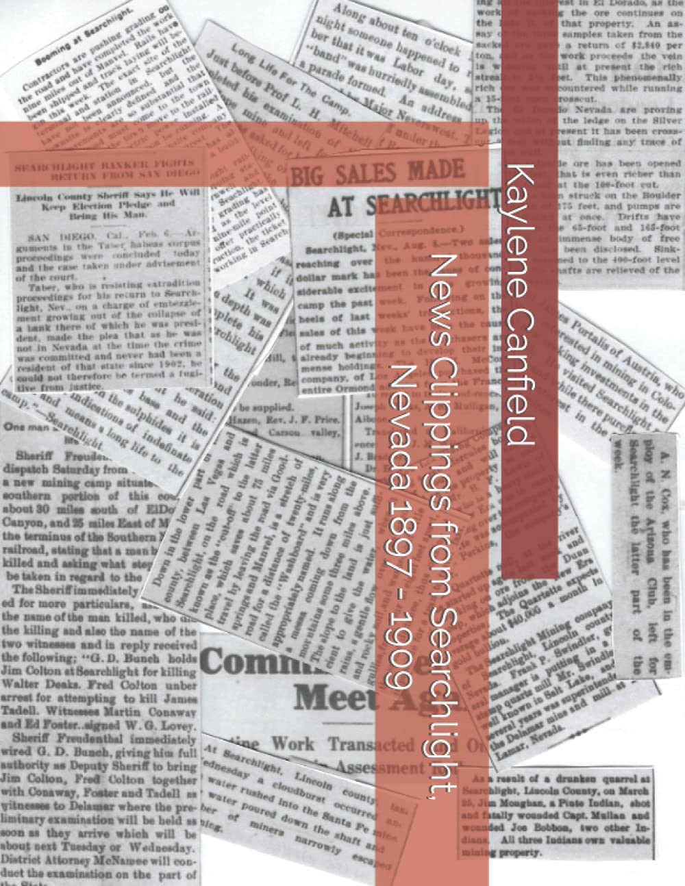 The mining was great, Searchlight, Nevada was a boom town. There were land arguments and agreements, dredging in the Colorado, railroad, stages and new roads. Shortages of wood for housing, with people still coming to town. They found turquoise and lots of gold. Family names include: Aleode, Allen, Arramdsen, Atwell, Atwilt, Baker, Ballant, Barnes, Barrett, Beattie, Beatty, Belgar, Bell, Benjamin, Bennett, Black, Bodie, Bowman, Bradley, Briggs, Bowman, Brockenbrou, Brown, Buckler, Bullock, Bunch, Burdick, Burns, Busteed, Butts, Campbell, Carter, Cassidy, Censer, Church, Clark, Clayton, Clements, Coleman, Colton, Conault, Conway, Cook, Copp, Courtaright, Coyle, Cox, Crawford, Creek, Crowley, Curiston, Dack, Day, Dean, DePuy, Detmers, Dexter, Doherty, Dunn, Durell, Earp, Egan, Ekelund, Elsen, Emerson, Enick, Erkenback, Ewing, Faber, Farguson, Fenton, Fisher, Flanagan, Fletcher, Forney, French, Frye, Garvin, Green, Greenley, Gilroy, Griffin, Grugan, Guston, Hal, Hansen, Harding, Harlan, Harland, Hawkins, Henderson, Henning, Hinke, Hitchcock, Hobson, Hodges, Hodson, Hopkins, Howard, Howe, Howell, Hunt, Jaberwood, Jacks, Jackson, James, Jennison, Johnson, Jost, Kearney, Kelly, Kennedy, King, Kittring, Kramer, Larsen, Latimer, Lewis, Lindstorm, Lindsay, Livingston, Loffer, Lynch, MacKinnon, MacReady, Martin, McClintock, McDonald, McEuter, McGregor, McIlvane, McLaughlin, McVey, Mathews, Mattman, Mauer, Merrill, Messiner, Metzkou, Middleworth, Mighton, Miller, Mills, Mitchell, Mitt, Monaghan, Moncreif, Monohan, Murphy, Myers, Nagle, Nelson, Ord, Paddock, Pauff, Peck, Perew, Perkins, Perocca, Perry, Phillips,Prescott, Previne, Price, Randolph, Rawson, Reals, Reeder, Reid, Rice, Robinson, Rose, Rouselle, Runcorn, Ruff, Sanford, Sayers, Scott, Shannon, Sherman, Sherwood, Simmons, Sinclair, Smith, Stack, Stevens, Stewart, Stiles, Stotler, Sulzer, Suprenant, Sutton, Taber, Taylor, Ulman, Vanina, Vaughn, Visscher, Vutch, Wallbeecht, Walte, Ward, Wardlaw, Watkins, Watt, Weaver, Webb, Webber, Wellman, Wharton, Wheatley, Wheatly, White, Whitson, Williams, Williamson, Withers, Woods, Wright, Wyle, Young Newspapers seen in this book: The Central Nevadan (Battle Mountain, Nevada), Churchill Standard (Fallon, Nevada), Churchill County Standard (Fallon, Nevada), The Courier (Genoa, Nevada), Daily Independent (Elko, Nevada), The Daily Silver State (Winnemucca, Nevada), Eureka Weekly Sentinel (Eureka, Nevada), Las Vegas Age (Las Vegas, Nevada), Las Vegas Times (Las Vegas, Nevada), Lincoln County Record (Pioche, Nevada), Lovelock Tribune (Lovelock, Nevada), Lyon County Times (Silver City, Nevada), Morning Appeal (Carson City, Nevada), The Pioche Weekly Record (Pioche, Nevada), The Record (Gardnerville, Nevada), The Silver State (Unionville, Nevada), Wadsworth Semi-Weekly Dispatch (Wadsworth, Nevada), Tonopah Bonanza (Butler City/Tonopah, Nevada), Walker Lake Bulletin (Hawthorne, Nevada), Weekly Independent (Elko, Nevada), The White Pine News (Treasure City, Nevada), Yerington Times (Yerington, Nevada) Please keep in mind that these articles are well over 100 years old. They have been stored, microfilmed, digitized and some may be not a clear as we would like.