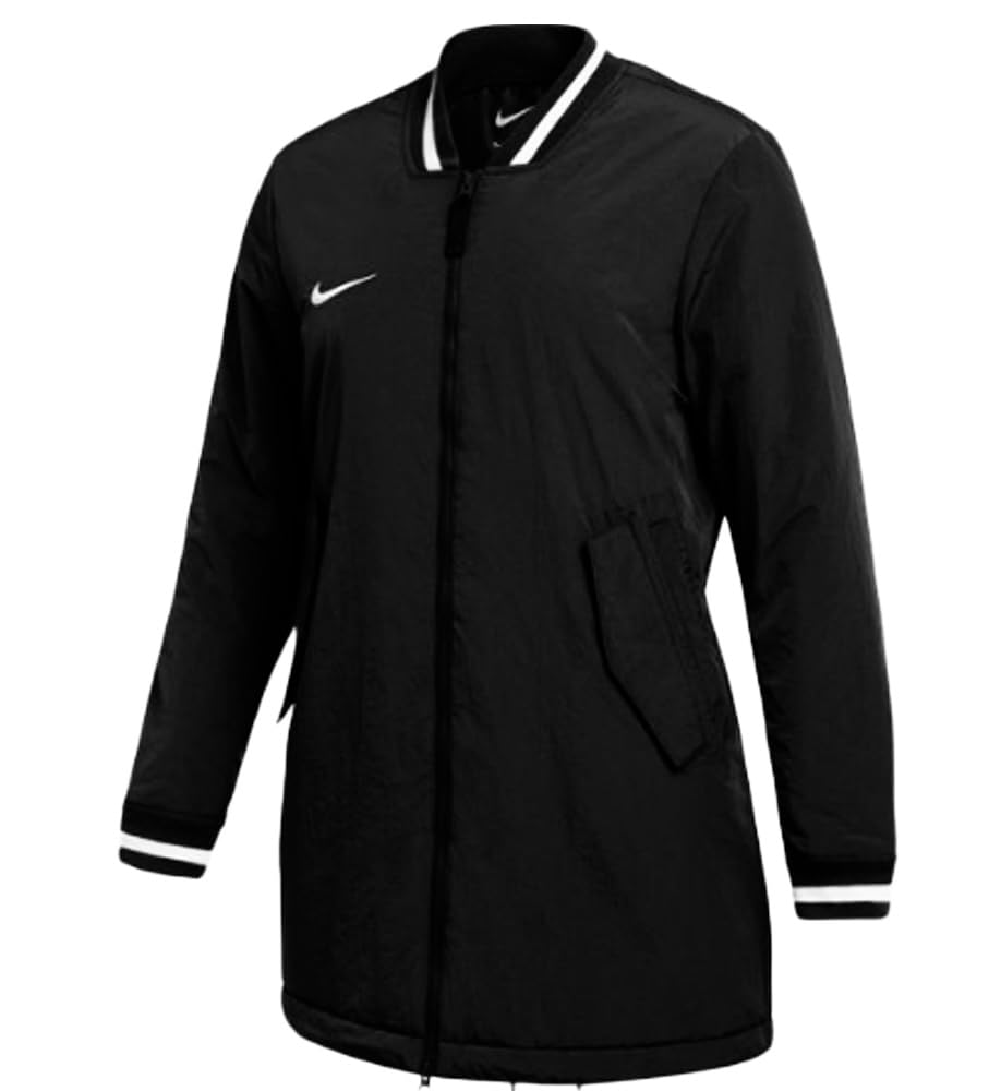 NIKE WOMEN'S STOCK DUGOUT REPEL INSULATED JACKET Closure Type: Zipper ; Sleeve Type: Long Sleeve Inspired by and made for the pros, the Nike Dugout Jacket draws on classic letterman vibes with a ribbed collar and cuffs and relies on durable, elevated, water-repellent fabric to help keep you comfortable even in less-than-ideal weather conditions. A mid-thigh length offers even more coverage to help you stay warm, while a full-length zipper lets you adjust if the sun comes out. This product is made with at least 50% recycled polyester and recycled nylon fibers. Water-repellent fabric helps keep you covered from the elements. A drawcord at the waist gives you 2 different looks. Double entry pockets give you a fleece-lined place to warm your hands and a separate, secure snap pocket for storing essentials. Customize the color for a look that complements your team's aesthetic. 100% nylon