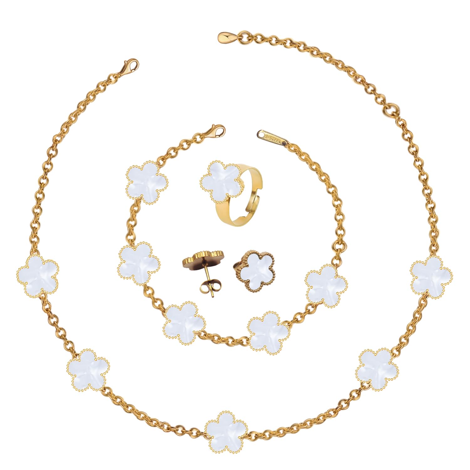 5 leaf clover is a symbol of love, hope, confidence, health and luck. Wearing a five-leaf clover necklace and bracelet every day can bring you the belief that you are happy and lucky. Size: Necklace Length:17.3in(44cm) & Extension Chain:1.4in(3.5cm); Bracelet Length:6.5in(16.5cm) & Extension Chain:2.1in(5.3cm); Earrings Length: 2.1in(5.3cm); Ring: open ring; Clover Diameter:0.5in(1.3cm). Material: Made of titanium steel and white shell, durable and colorfast, hypoallergenic, suitable for most people's skin type. Matching our lucky bracelets and necklace with your outfits can make you look more stylish and elegant overall, suitable for daily wear, outfit accessories, wedding, party, birthday, ball, anniversary, valentine. Package Included 1pc clover bracelet/ 1pc clover necklace/ 1 pair stud earrings and 1 adjustable ring for women. Ninejuize 4 Pcs Set Cute Clover Necklace Clover Bracelet Clover Ring Clover Stud Earrings Set 18k Gold Plated Lucky Clover Sets