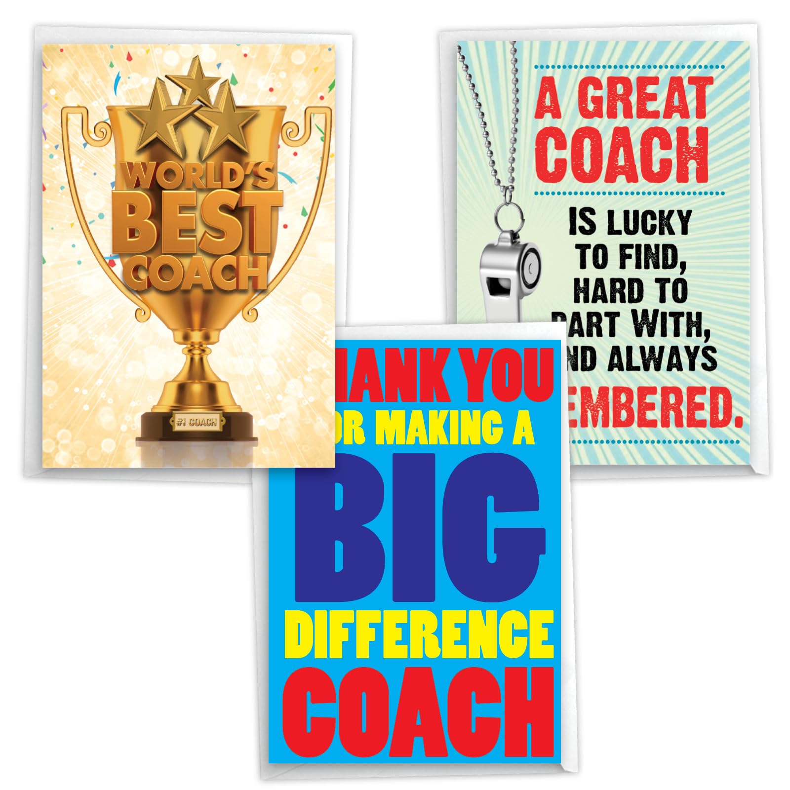 ASSORTED INSIDE MESSAGES – This is an assortment of greeting cards, with each card having its own unique greeting. Please, carefully review all product photos to view what each card’s inside sentiment (and cover text) says. SIZE - Receive 3, regular sized notecards with 5x7 envelopes. We offer funny cards that come either blank or greeted inside, so be sure to review all product photos before purchasing. USE - The ideal, humorous cards for writing Thank You wishes! Card's cover page is printed with a gloss finish, and the interior pages provide a smooth, flawless writing surface for men and women. SOCIALLY RESPONSIBLE - Keeping US jobs at home, our products are Made in the USA (and Canada) for almost 40 years. We use thick, white, glossy cardstock, w/ 30% recycled content (no papyrus, naturally). A great Coach is deserving of great Thanks. So, if your sports or recreational team is lucky enough to have an awesome coach, make sure you and the other players or participants appreciatively acknowledge and reward that remarkable group leader using any of the magnificent Thank You Coach cards from this winning three pack. A gold star trophy, a chained silver whistle and huge, multicolored words are fantastically featured on the three different, but all applauding, gratitude greetings huddled up here to send out to Coach. Because a truly amazing coach can upgrade your life, as he or she is upping your game, and that makes them definitely deserving of well earned gratefulness.