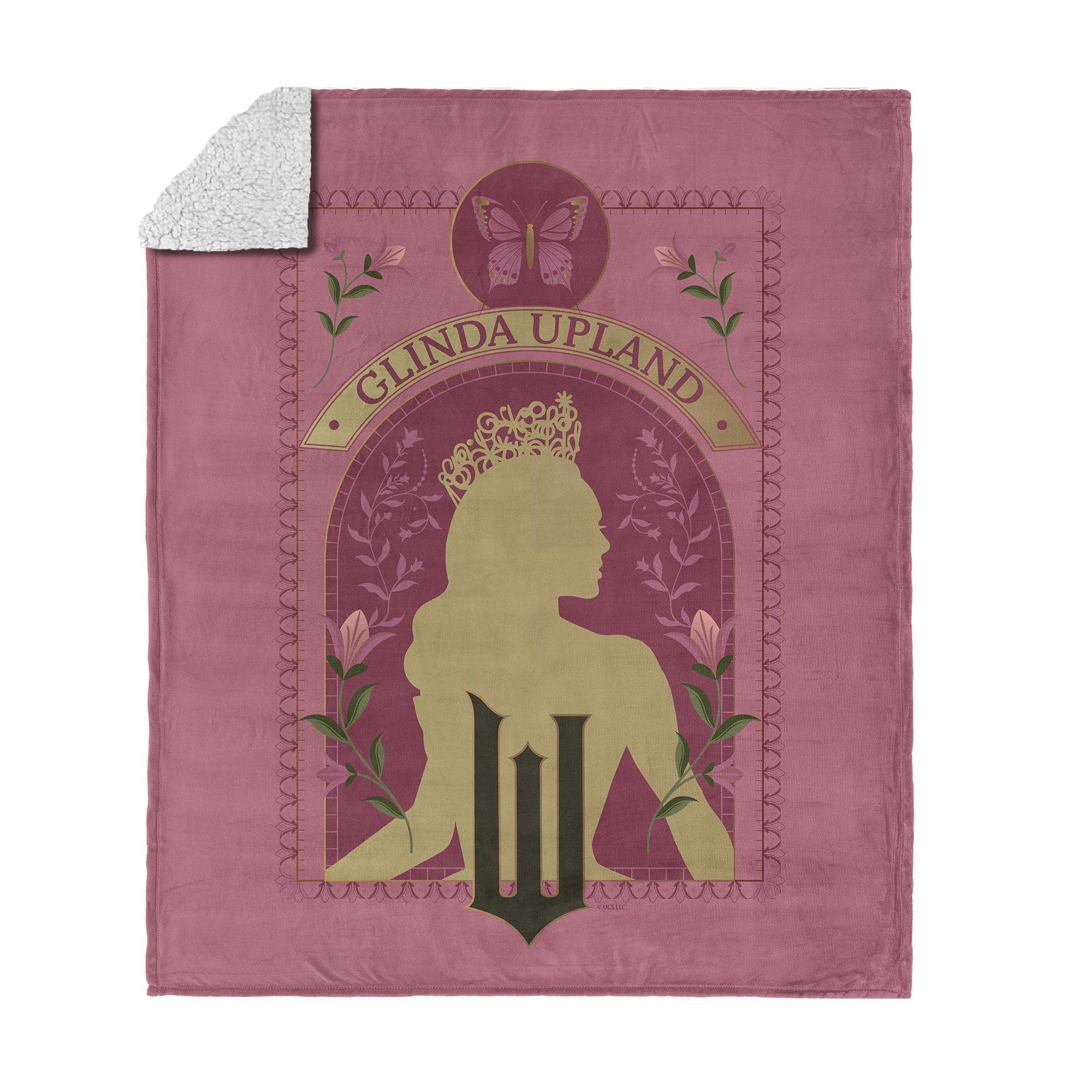 100% Polyester Featuring a radiant golden silhouette of Glinda crowned in her tiara, surrounded by blooming pink flowers, graceful vines, and a delicate butterfly motif above her name. Silky-soft, warm and cozy throw; neutral color back 50 x 60 inches Machine wash cold separately using delicate cycle and mild detergent. Do not bleach. Machine dry separately on gentle cycle. Remove promptly. Do not iron. Made of 100% Polyester