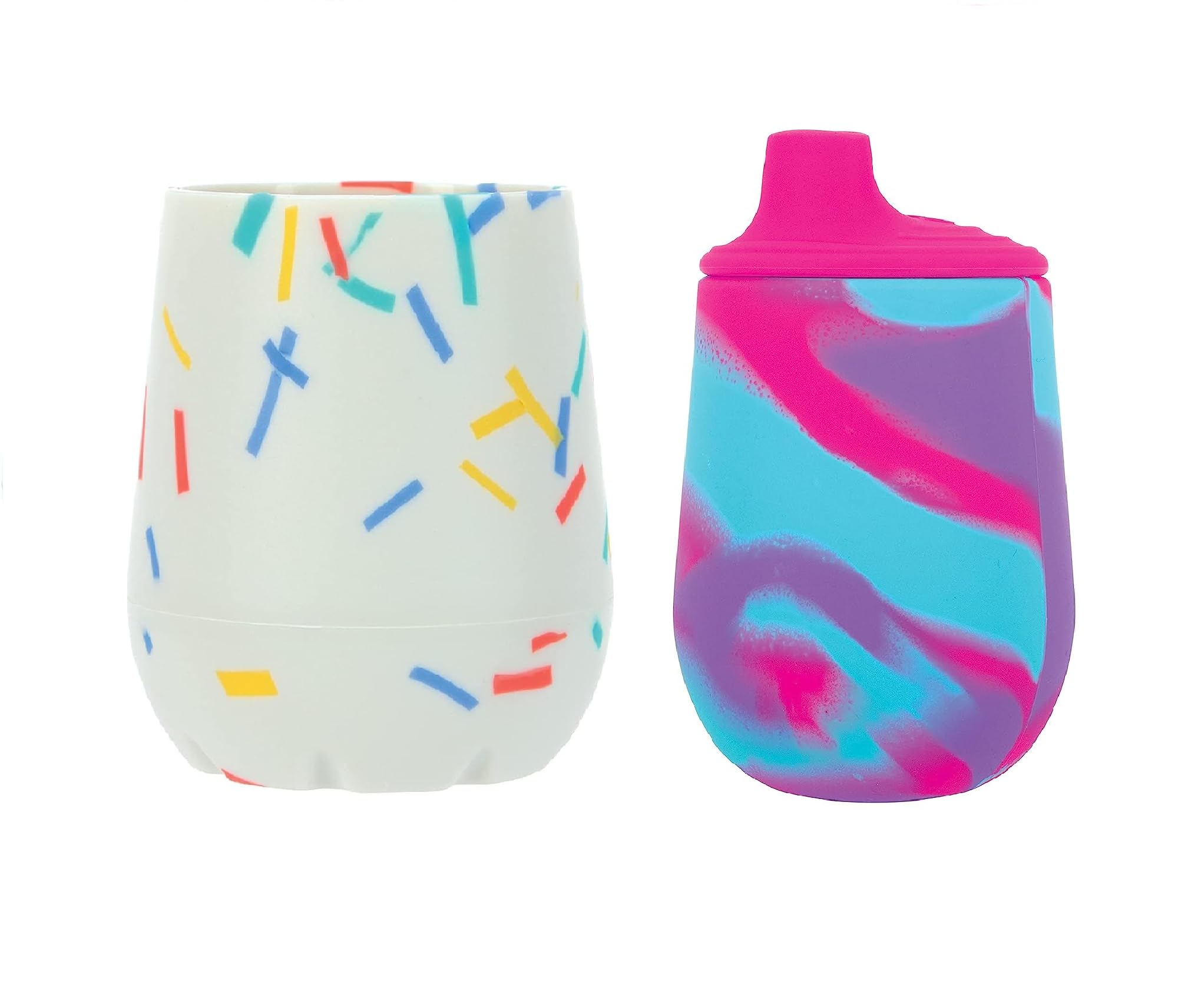 Confetti/sprinkle cup is Ideal for babies who are transitioning from breastfeeding / bottle feeding to cup drinking. Super soft silicone rim is gentle on baby’s gums and new teeth and matte silicone base ensures baby has a non-slip grip when the holding cup. Pink/Purple Tie-dye cup: Free flow into natural, easy drinking with the awesome fun green and blue tie-dye silicone trainer cup. Designed perfectly for little hands and taking those first steps towards grown-up drinking. With a non-slip silicone base that tiny hands can hold onto more easily your baby will be taking one sip at a time in no time and drinking like a pro! BPA FREE, 2 oz, 6 months + The cup grows with baby! When baby is ready to transition to open cup drinking simply remove the silicone spout. BPA FREE, 6 months + , 6 oz , Pink/Purple Nuby's Fisrt Training Cup Tumblr will help your baby strengthen their oral motor skills. It's non-slip deisgn makes it easy to grip and the cup angle creates a steady flow for safer sipping. Safe for both hot or cold drinks and food!