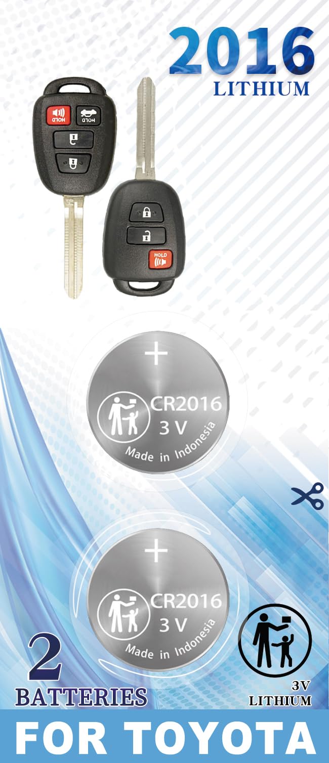 EACH ORDER INCLUDING - Two (2) CR2016 Remote Fob Batteries + Installation Tools + Installation Videos. (PLEASE NOTE: Keyless entry remote fob not included.) Compatible with Toyota Key Remote Fobs Including - 86 (2017-2019), 4Runner (2010-2020), Avalon (2008-2013), Camry (2006-2018 ), Corolla (2008-2019), Highlander (2014-2019), Matrix (2008-2014), Prius C (2012-2019), Rav4 (2012-2018), Scion FR-S (2014-2016), Scion iQ (2014-2015), Scion tC (2014-2016), Scion xB ( 2013-2015), Scion xD (2014), Sequoia (2019-2020), Tacoma ( 2015-2022), Tundra (2018-2019), Venza (2009-2016), Yaris (2007-2016)(fits FCC ID’s: HYQ12BDM HYQ12BEL HYQ12BDM GQ4-52T) ORIGINAL OEM BATTERY - Original OEM Battery as Provided by Manufacturer ensuring perfect fit and great reliability. (Long Lasting with long expiry date.) STABLE VOLTAGE OUTPUT & HIGH PERFORMANCE - Using high quality core raw materials and precision manufacturing process make battery safer. HIGH SAFETY AND EASY INSTALLATION - Avoid expensive dealer service charges for battery replacement, remote reprogramming is not required. Opening/Pry Tool included to help you open the remote without scratching or damaging your remote case. (Includes step-by-step installation video) TESTED AND WORKS IN THE FOLLOWING REMOTES: