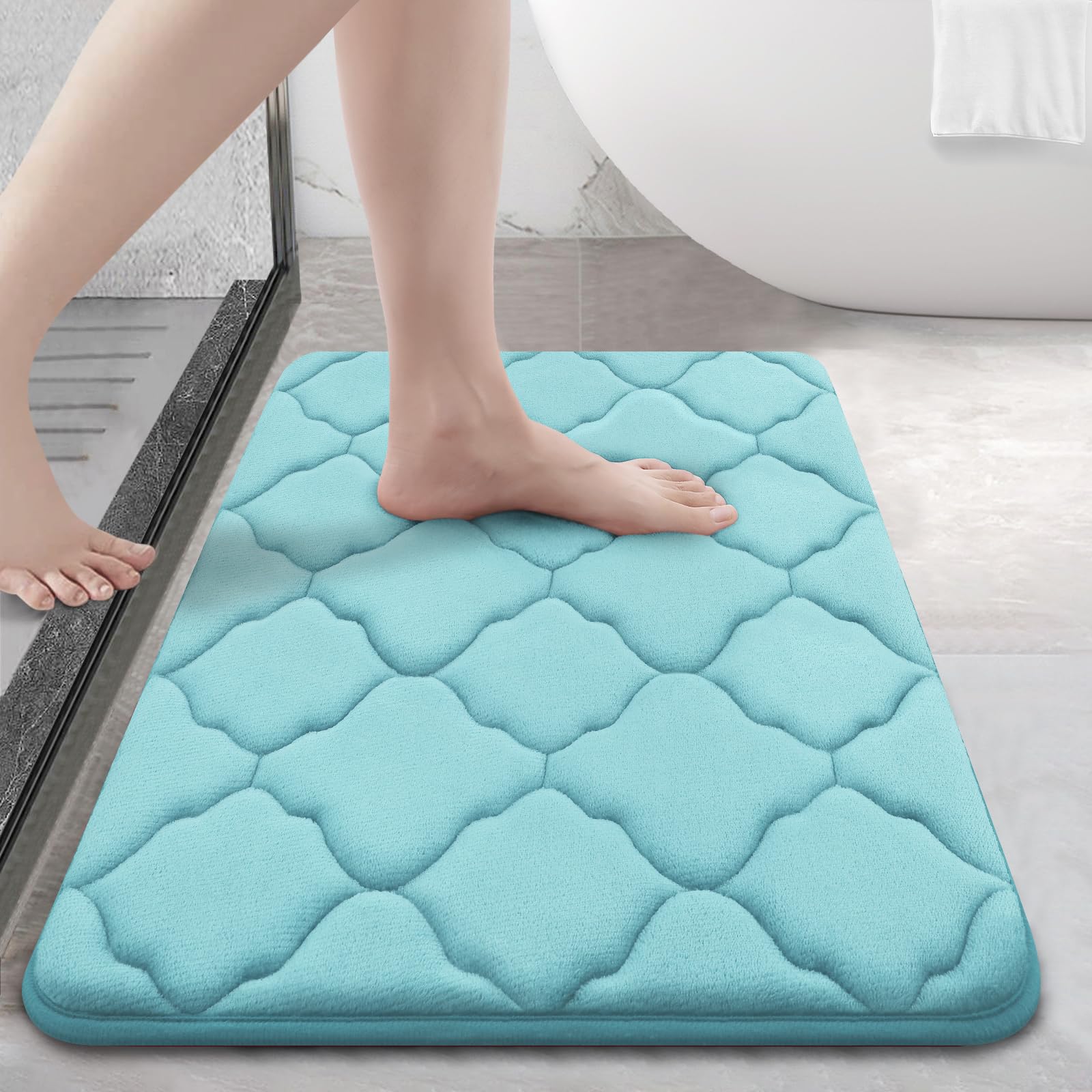 [STYLISH AND CLOUD-LIKE COMFORT] OLANLY's Memory Foam Bath Mat boasts an elegant Moroccan design, infusing a touch of modern luxury into your space. Crafted from ultra-soft microfiber coral velvet outer material and thick cushion memory foam, our bathroom rug provides a cloud-like comfort that contours to the shape of your body, making every step a luxurious experience. [SWIFT DRYING BLISS] Pamper yourself with the rapid-drying comfort of OLANLY's soft velvet microfiber bath rugs, providing a delightful solution for moisture absorption after your bath or shower. Immerse yourself in the convenience of a fast-drying memory foam bathroom mat. [STURDY PVC SUPPORT] OLANLY's bathroom mat features a robust and enduring PVC backing, designed to prevent any shifting or skidding. This superior construction sets it apart from mats with rubber backing that may degrade over time. Ensure the area beneath the rug stays dry for optimal performance, and never place it on wet surfaces. [EASY-CARE VIBRANCE] Elevate your bath experience with our easy-to-maintain rugs. These machine-washable bath rugs keep their vibrant colors intact, adding a touch of brilliance to your living spaces. Incredibly easy to clean and maintain, they stay fresh even after multiple washes. The fade-resistant feature ensures the longevity of their vibrant colors. [VERSATILE LUXURY] Transform your bathroom with OLANLY's memory foam bath mat – a stylish and plush addition to your daily routine. Whether positioned by the tub, shower, or sink, savor the soft opulence underfoot and elevate your bathing experience with timeless elegance. OLANLY Memory Foam Bath Mat Rug 24x16, Ultra Soft and Absorbent Bathroom Rugs, Non-Slip, Comfortable, Machine Washable Bath Carpet for Bathroom Floor, Tub, Shower and Home Decor Accessories, Sky Blue