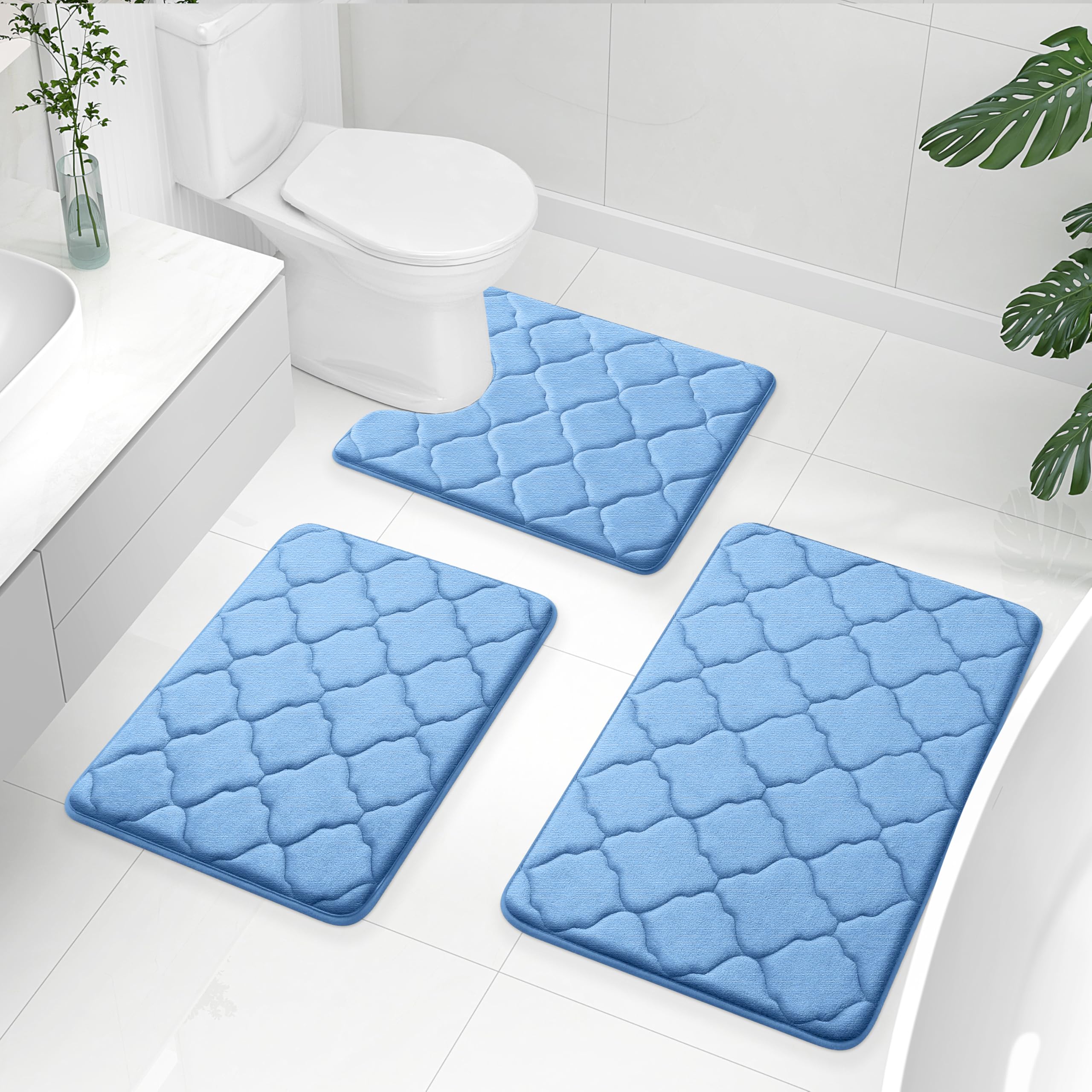 [STYLISH AND CLOUD-LIKE COMFORT] OLANLY's Memory Foam Bath Mat boasts an elegant Moroccan design, infusing a touch of modern luxury into your space. Crafted from ultra-soft microfiber coral velvet outer material and thick cushion memory foam, our bathroom rug provides a cloud-like comfort that contours to the shape of your body, making every step a luxurious experience. [SWIFT DRYING BLISS] Pamper yourself with the rapid-drying comfort of OLANLY's soft velvet microfiber bath rugs, providing a delightful solution for moisture absorption after your bath or shower. Immerse yourself in the convenience of a fast-drying memory foam bathroom mat. [STURDY PVC SUPPORT] OLANLY's bathroom mat features a robust and enduring PVC backing, designed to prevent any shifting or skidding. This superior construction sets it apart from mats with rubber backing that may degrade over time. Ensure the area beneath the rug stays dry for optimal performance, and never place it on wet surfaces. [EASY-CARE VIBRANCE] Elevate your bath experience with our easy-to-maintain rugs. These machine-washable bath rugs keep their vibrant colors intact, adding a touch of brilliance to your living spaces. Incredibly easy to clean and maintain, they stay fresh even after multiple washes. The fade-resistant feature ensures the longevity of their vibrant colors. [VERSATILE LUXURY] Transform your bathroom with OLANLY's memory foam bath mat – a stylish and plush addition to your daily routine. Whether positioned by the tub, shower, or sink, savor the soft opulence underfoot and elevate your bathing experience with timeless elegance. OLANLY Memory Foam Bath Mat Set of 3 Piece, Bathroom Rugs and Toilet Rug U-Shaped, Ultra Soft and Absorbent, Comfortable, Non-Slip, Machine Washable, Shower and Home Decor Accessories, Blue