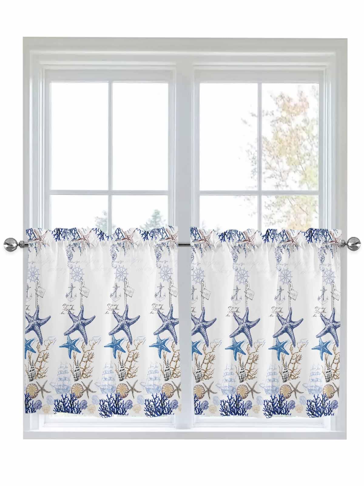 Ocean Beach Starfish Kitchen Curtain 36 Inch Length Small Short Cafe Tiers Drape, Blue Coastal Coral Shell Nautical Boat Window Treatment Rod Pocket