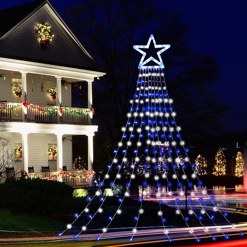 【PERFECT CHRISTMAS OUTDOOR DECORATIONS LIGHTS】.These outdoor christmas tree lights with Star works great with trees from around 8 feet to 13 feet tall.Start by hanging the star on the top of your tree. Then attach the 9 lines little star lights to the biggest star and let them drape to the ground, following the shape of the tree.It looks like star glittering in the night sky. It will be a beautiful addition to your outdoor decorations 【About Christmas Decorations Star Lights】317 LED ,1 top star ornaments with 9 strand string lights, the large star ornaments diameter is 12.6IN,Each string lights length:11.5ft. Plug cable length:16.4ft. Light up Your Christmas with this Christmas star string lights! 【8 Lighting Modes&Timer and Waterproof】: The christmas tree lights have 8 different lighting modes: steady on,combination, in waves, sequential, slo-glo, chasing/flash, slow fade and twinkle/flash. IP44 waterproof lighted christmas decorations are perfect for indoor and outdoor decorations. 【Use Safely &Easy to Installation 】30V low voltage plug with UL certified to ensure safety use.Plug and unplug the power directly to turn on and off.Easy to be hung on a tree or roof to make a decoration to your yard.When you installation, Just hanging the big star on an exterior wall, tree or eaves,and the 9 string lights fall to ground. 【RELIABLE 1 YEAR CUSTOMER SERVICE】If you're unsatisfied with this Christmas star lights for any reason, please feel free to contact YULIANG and we will give you a satisfactory solution Christmas Decorations Star Lights, Top Star with LED Lights for Christmas Tree and Holiday Seasonal Decoration