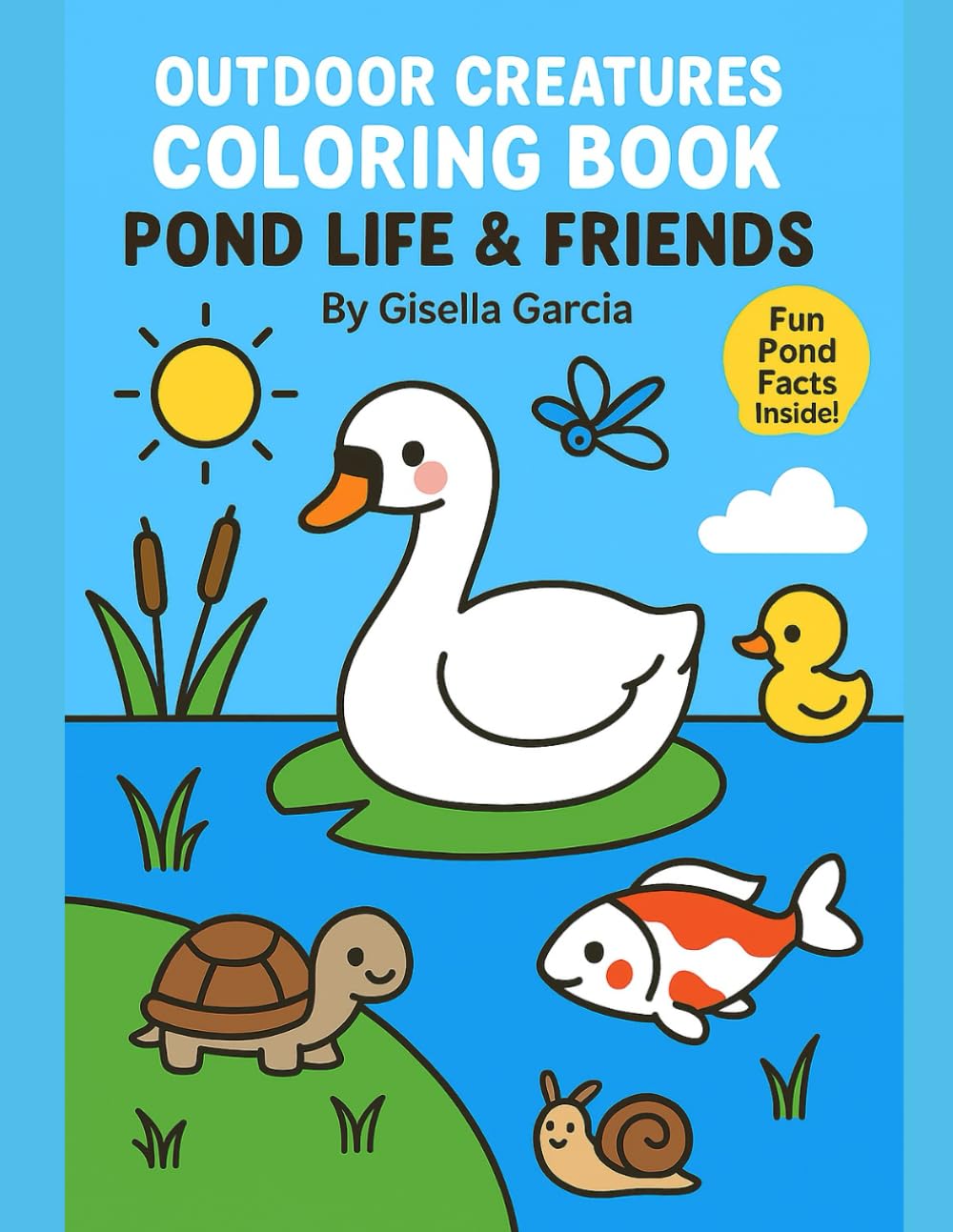 Outdoor Creatures Coloring Book: Pond Life & Friends by Gisella Garcia Take a trip to the pond and meet the wonderful creatures that live there! From leaping frogs and swimming turtles to graceful swans and playful otters, this coloring book is filled with fascinating pond friends for kids to discover. Each page includes: ✅ Fun Facts – Learn something cool about each creature. ✅ Playful Prompts – Encouraging directions that spark imagination. ✅ Coloring Pages – Simple, bold outlines perfect for kids ages 4–8. ✅ Activity Pages – Word games, puzzles, and matching fun to keep learning exciting! This book is part of the Outdoor Creatures Coloring Book Series , designed to help children explore the natural world while boosting creativity, focus, and curiosity. Perfect for: 🎨 Kids ages 3–9 who love animals and nature 📚 Parents and teachers looking for fun, educational activities 🎁 Birthdays, classroom rewards, or nature-themed gifts ✨ At the end, kids will earn their very own Pond Life Explorer Certificate to celebrate their adventure! Keep exploring with the Outdoor Creatures Coloring Book Series —more fun themes are on the way, including Ocean Friends, Arctic Animals, and Safari Animals!