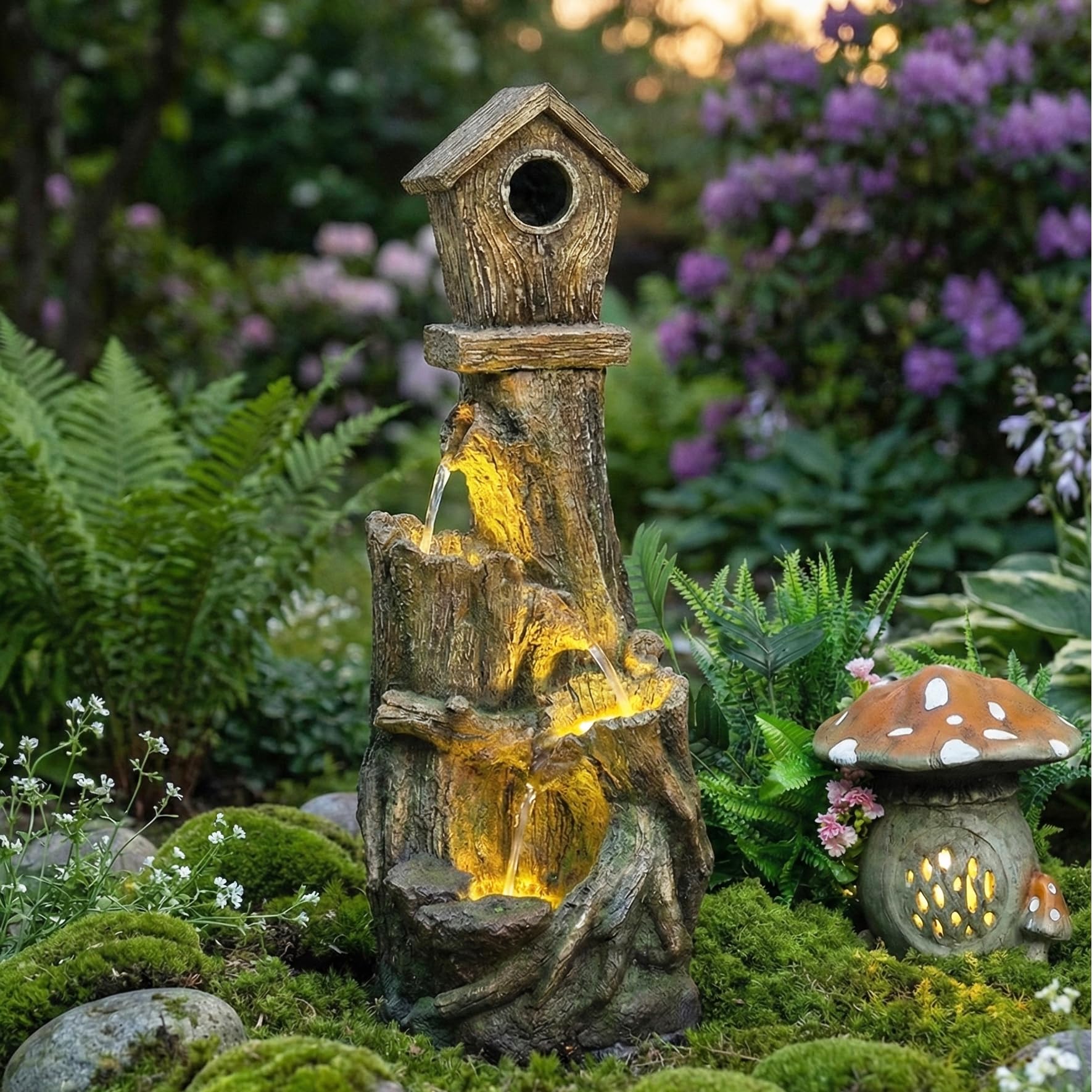 Natural Looking Rock Outdoor Fountain:This large outdoor water fountain, crafted from high - quality fiberglass resin, seamlessly blends into your garden, patio, or lawn. It's not just a fountain; it's a portal to a natural haven right in your outdoor space. Multi Functional Design:The outside fountain for backyard is not only a beautiful water feature decoration, but also its gentle flow of water emits a calm and relaxing sound that you will surely love, which can wash away the exhaustion of a whole day. Noise - Masking & Relaxation:The flowing water of our waterfall outdoor fountain masks unwanted outdoor noises, creating a peaceful environment. Sit back and relax in your patio backyard, surrounded by the calming sound of water. LED Light:Featuring fountain LED lights, it lights up your outdoor garden at night. The warm glow not only enhances the beauty of the fountain but also provides a cozy atmosphere for evening gatherings. Treehouse Outdoor Fountain:Crafted with an organic treehouse design that harmonizes with nature, this outdoor freestanding fountain transforms patios, lawns, and gardens into captivating outdoor oases. The artisanal structure blends seamlessly with natural surroundings, creating a storybook ambiance in your backyard Elevate your outdoor oasis with our Large Fiberglass Outdoor Water Fountain, a stunning floor-standing water feature designed to transform garden patios, lawn porches, and outdoor gardens into serene retreats. Crafted from durable, weather-resistant fiberglass, this waterfall fountain combines rustic charm with modern art decor, featuring cascading water flows that mask urban noise and create a calming ambiance. Integrated fountain LED lights illuminate the cascades with a warm glow, perfect for evening relaxation in your patio backyard or as a striking home art accent indoors. Ideal for both indoor fountain and fountain outdoor use, this versatile piece adds natural elegance to balconies, decks, or entryways. Its water feature design not only enhances art decor but also humidifies dry air, improving indoor air quality. The low-maintenance construction requires minimal upkeep, while the robust fiberglass ensures resistance to rain, UV rays, and temperature fluctuations, making it a year-round centerpiece for outdoor gardens or patio yards. Easy to assemble with pre-installed components, this large fountain is perfect for busy homeowners seeking tranquility. Whether placed in a sunroom as an indoor fountain or as a focal point in a lawn porch, its soothing sounds and LED lights create an inviting atmosphere day and night.