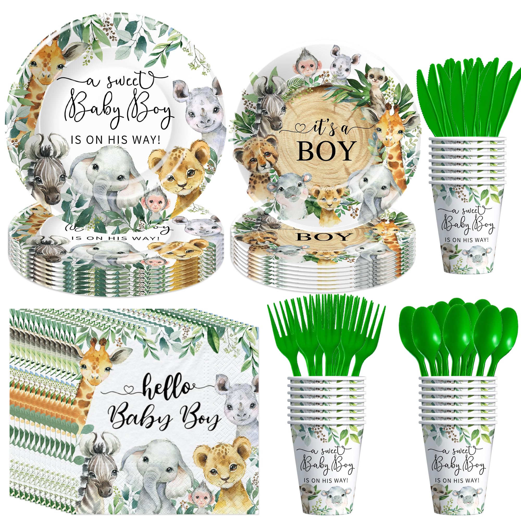 This safari theme baby shower decorations for boy includes everything you need to host an exciting event—plates, cups, napkins, banners, and tablecloths
