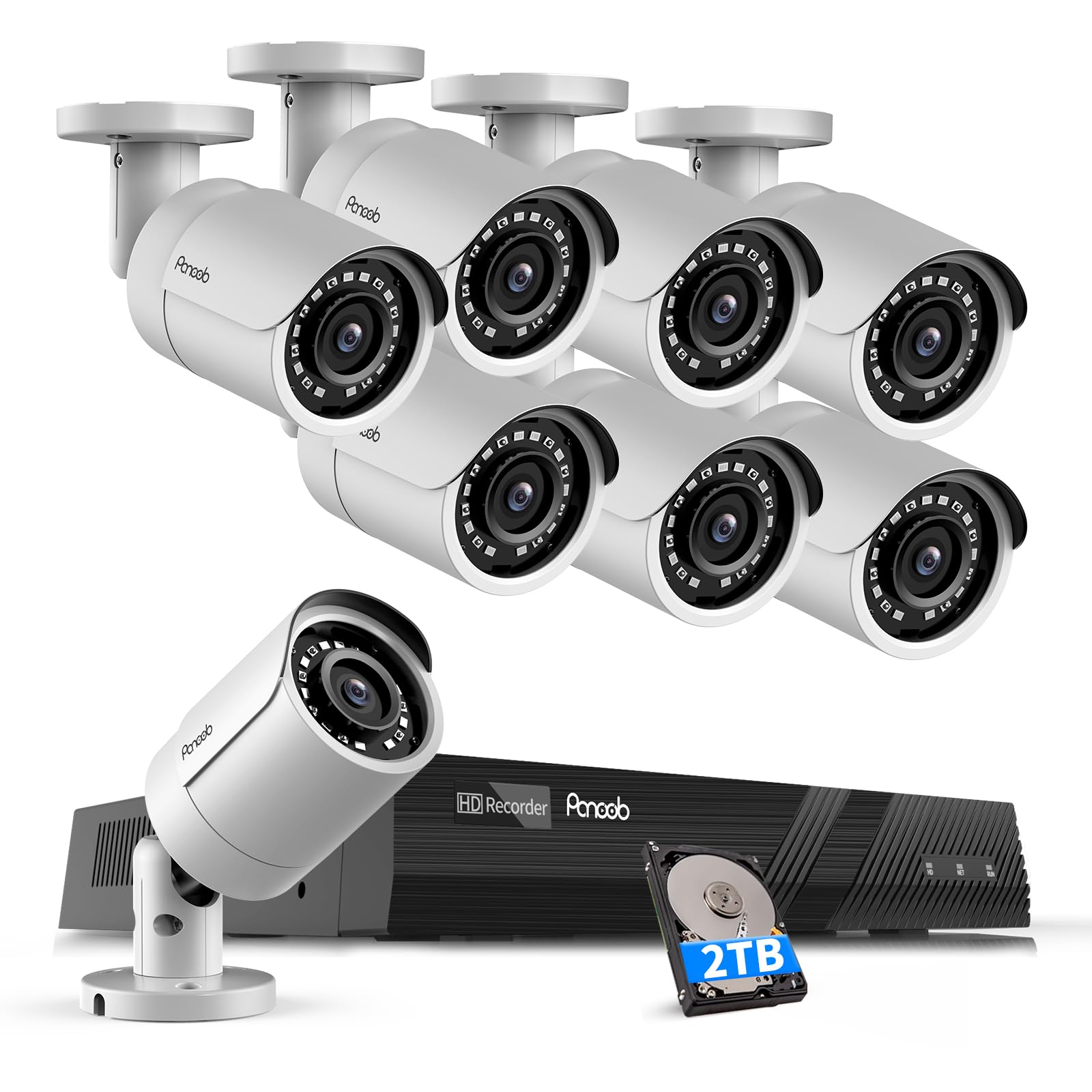 Overview: This poe camera system includes 8 channel 4K PoE NVR and 8pcs 8MP IP PoE cameras. The PoE NVR is pre-installed with a 2TB hard drive. The camera lens is 2.8mm with 110-degree wide-angle, sturdy metal casing camera is protected against water and dust with IP67 ranking, making it suitable for indoor or outdoor environments. The camera with a built-in microphone one-way talk. Human/ Vehicle Detection: Panoob cameras comes with advanced AI intelligent motion detection technology, which can detect human and vehicle from shape. This effectively reduces the number of unwanted false alarms from insects or leaf. You will get push notifications from smart phone APP. Remote Monitoring: Panoob PoE NVR APP "GUARD VIEWER" allows you to access all the cameras, you can check the monitoring areas that you cared about anytime and anywhere. P2P ( Plug and Play): Integrated power over ethernet (PoE) provides simple plug and play installation, it makes full HD video surveillance system without complex configuration. PANNOB PoE NVR support this with only one network cable to transmit video, audio and power, which is suitable for beginners and camera DIY fans to set up their own surveillance system simply and easily. Night Vision: Powerful infrared lights provides high-quality night vision and longer night visible distance up to 100ft, it offers you crystal clear image even in darkness. Quality Assurance Service: We offer 2 Years product quality assurance and lifelong technical support. Contact us by local USA Phone service or email support if any questions. This 8 channel security system has 8 PoE ports and 2TB HDD pre-installed, which means you can extend your system with more cameras if necessary. All of these IP cameras are built in microphone, 2.8mm lens, unique waterproof and anti-fog producing technology, IP67 weatherproof and features 65- 100ft IR night vision, for both outdoor and indoor use,we offer 4MP 5MP 6MP 8MP cameras. Here are different features PANOOB PoE cameras available, like full color IP camera, PTZ camera, two-way audio IP camera. With Power over Ethernet(PoE), you can connect Ethernet cable to power your PoE security cameras. It supports plug and play, data transmission and installation is easier. This PoE camera built-in Mic for audio recording, it will provide you with more voice information and expand your security coverage beyond the camera's field of view. The monitoring system supports intelligent motion detection. The intelligent PoE IP camera can identify people and vehicles, customize the detection area and type, and choose the alarm reminder you need to avoid being triggered by small animals or shadows unnecessary alerts. The latest H.265 compression technology reduces video file sizes, save valuable hard drive space and provides an excellent and smooth viewing experience. Featuring 2.8mm fixed lens with IR-Cut function, 110° viewing angle, up to 100ft IR Night Vision, IR-cut filter helps to capture surroundings in low lighting conditions, can clearly monitor everything even at night. With the Guard Viewer App on your smartphone, tablet, or computer, you're in complete control of your home's security. You can check the recording from anywhere and anytime. Create customized motion detection, you can be alerted to what matters.