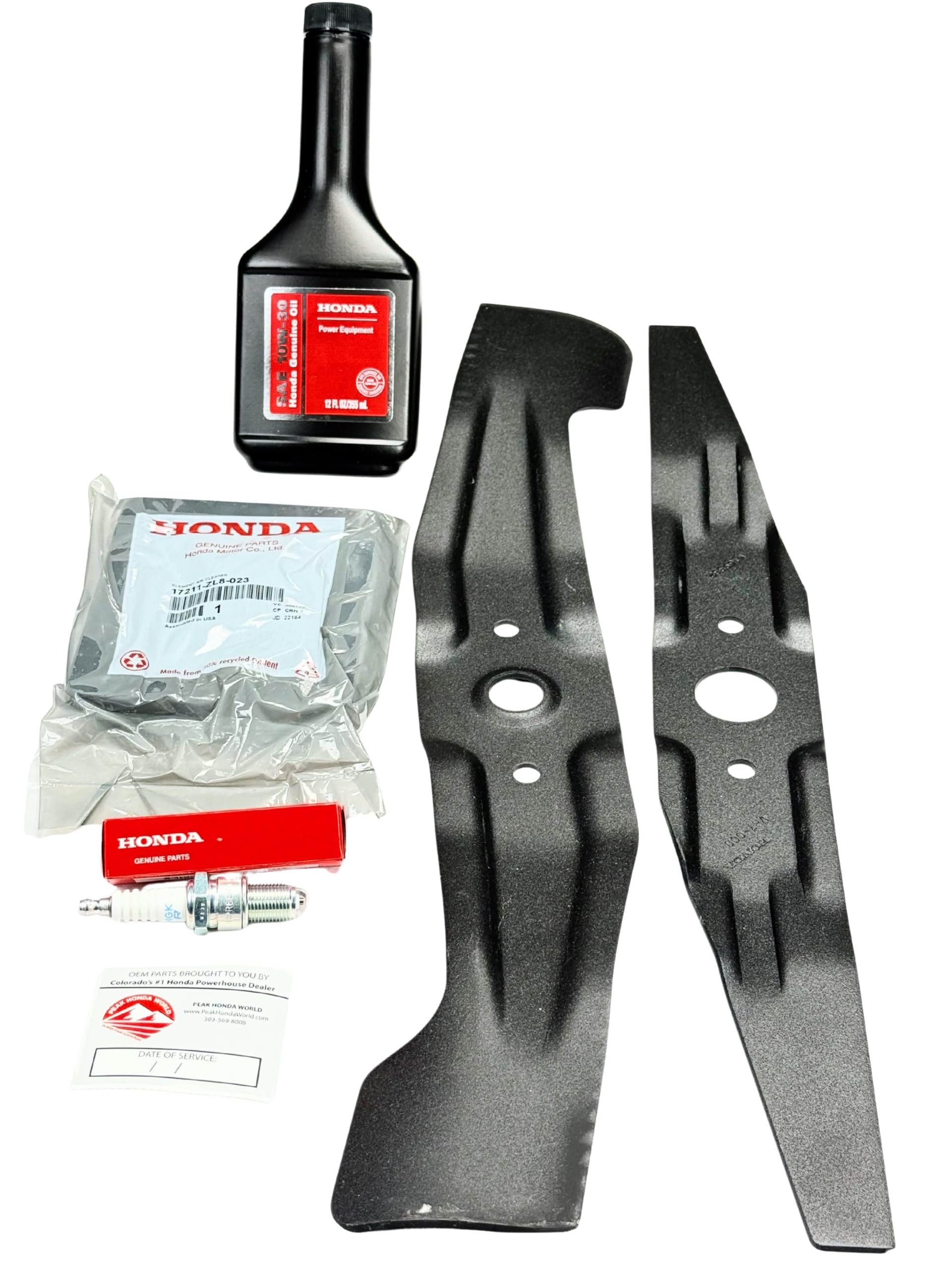 Precision Blade Set – Designed for clean, consistent cuts and long-lasting durability. 72511-VH7-000 & 72531-VH7-000 Air Filter – Maintains proper airflow and ensures efficient engine performance. 17211-ZL8-023 Spark Plug – Delivers reliable starts and smooth combustion for peak efficiency. 98079-55846 Engine Oil – 10W30 small engine oil for lubrication and engine protection. 08213-10W30 Peak Honda World Service Reminder Decal – Helps track your next scheduled maintenance. Serial Number Range MZCG-8670001 and up, Engine S/N < 2019418 PEAK HONDA WORLD Maintenance Kit – Compatible with HRR216K9-K11 Engine Serial Number greater than 2019418, Lawn Mowers. Maintain your lawn mower with the PEAK HONDA WORLD Maintenance Kit. This complete kit includes high-quality replacement parts to restore engine power, improve cutting precision, and enhance fuel efficiency while protecting your mower’s longevity. Kit Includes: ✔ Replacement Blade Set – Upper and lower blades for clean, precise cuts. ✔ Air Filter – Helps maintain proper airflow and engine efficiency. ✔ Spark Plug – Ensures smooth starts and optimal engine function. ✔ Engine Oil – 10W30 small engine oil for lubrication and protection. ✔ Service Reminder Decal – A tracking decal to mark your next maintenance date. Compatibility: This PEAK HONDA WORLD Maintenance Kit is compatible with Honda lawn mowers. Please check your owner’s manual to verify fitment before purchasing. Why Choose PEAK HONDA WORLD? ✔ Designed for easy, routine maintenance. ✔ Helps extend the lifespan of your lawn mower. ✔ Convenient all-in-one kit for hassle-free servicing.