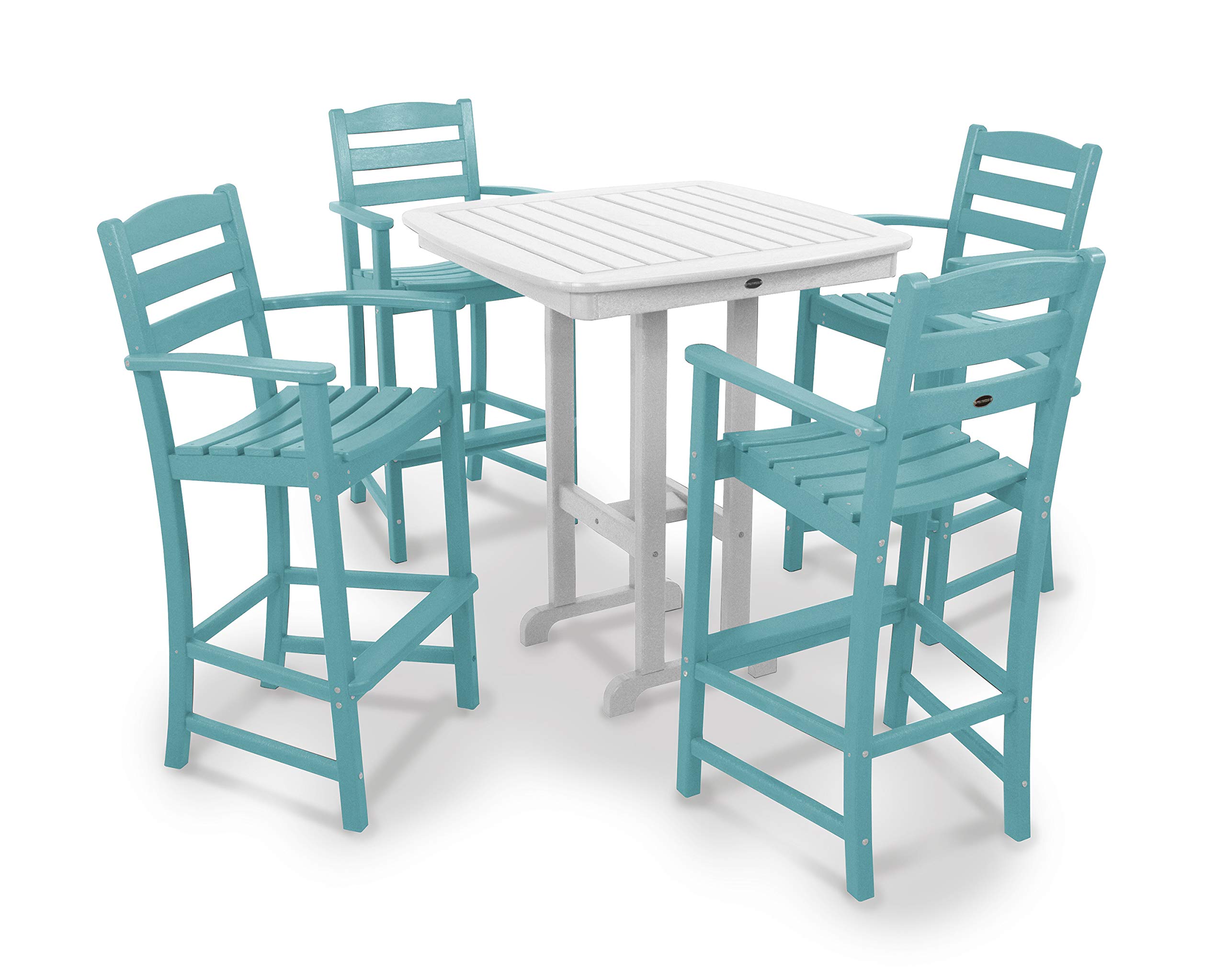 Set includes four TD202 La Casa Café Bar Arm Chairs and one NCBT37 Nautical 37" Bar Table Constructed of genuine POLYWOOD lumber, a proprietary blend of plastics which includes recycled milk jugs and detergent bottles Solid, heavy-duty construction withstands nature's elements POLYWOOD lumber requires no painting, staining, waterproofing, or similar maintenance POLYWOOD lumber does not splinter, crack, chip, peel or rot and it is resistant to corrosive substances such as oil, salt spray and other environmental stresses Find out how quickly you raise the bar for outdoor entertaining when you invite guests to gather around the POLYWOOD La Casa Café 5-Piece Bar Set. It includes four La Casa Café Bar Arm Chairs and a Nautical 37" Bar Table. This set is as comfortable as it is good-looking and since it's available in attractive color choices, you're sure to find one that coordinates with your outdoor décor. Constructed of POLYWOOD all weather recycled lumber, this set is not only durable but very low-maintenance, too. Unlike real wood, it never requires painting, staining or waterproofing and it won't splinter, crack, chip, rot or peel. You'll love how easy it is to clean with soap and water as it resists stains from wine and condiments, corrosive substances, salt spray and other environmental stresses.