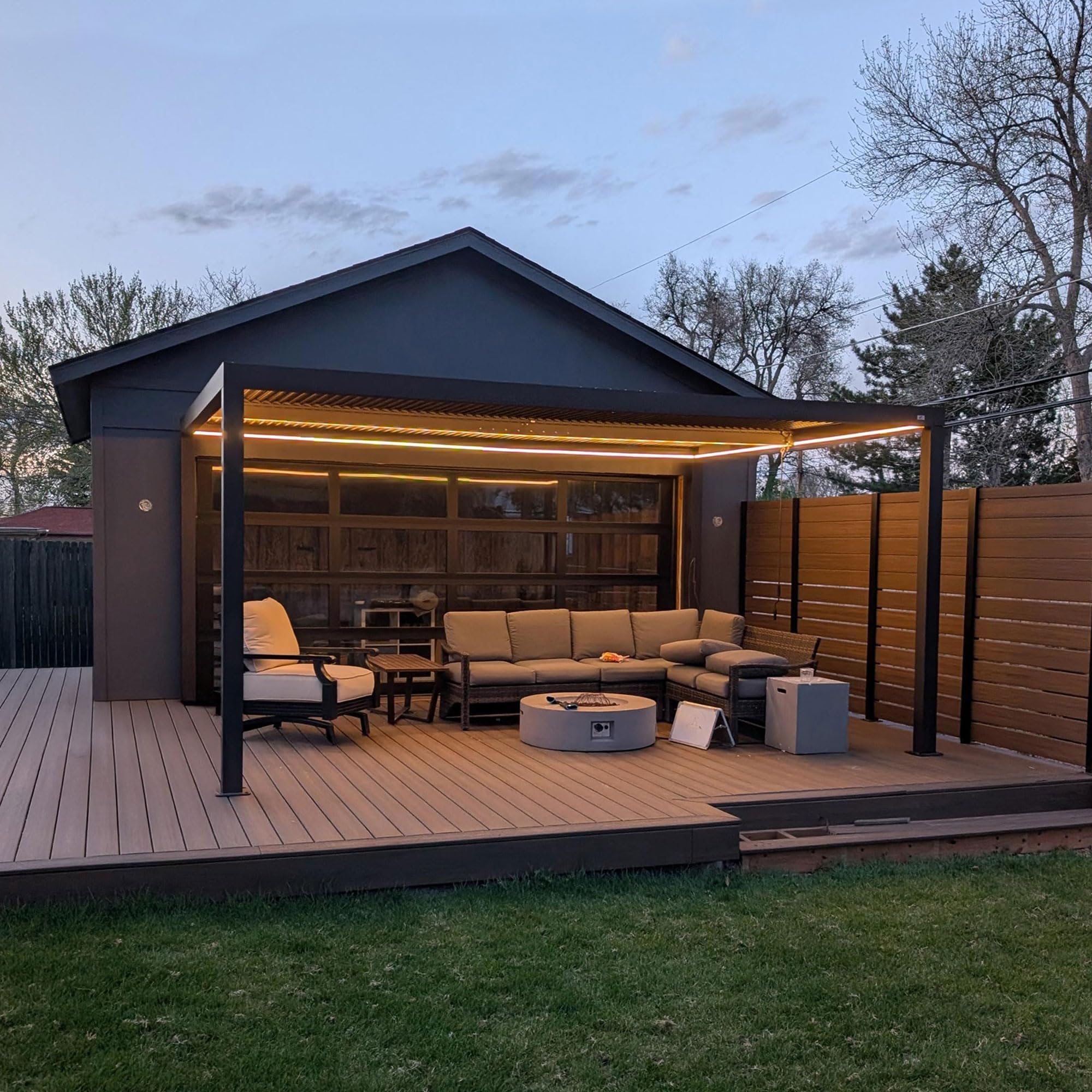 Lighted Pergola: Remote-controlled waterproof LED strip lights, 3000K warm glow for a relaxing outdoor ambiance. Reinforced Construction: The durable aluminum framework and improved larger beam size ensure the pergola withstands 60 mph winds. 0° to 90° Adjustable Pergola Louvers: Unique design of two independent adjustable roofs customizes the shade up to 168 square feet, allowing you to do different things in two adjacent areas. Hidden Water Gutter Design: The advanced integrated drainage system effectively diverts rainwater from the louvers into the posts in four directions and then to the ground, preventing water accumulation on the roof. Premium Aluminum Material: Made from high-grade aluminum, our pergola is rust-resistant, durable, scratch-resistant, slip-resistant, and fade-resistant. Protection Plan: 1 year for frame construction. Easy to assemble. Disclaimer: Furniture NOT INCLUDED. PURPLE LEAF doesn't offer installation service. All the installation service from the order page is from third parties. The outdoor louvered pergola features an adjustable hardtop louvered roof, providing shade customization based on your preferences. Its sturdy galvanized steel louvered roof and powder-coated aluminum frame ensure durability for all seasons, and reduce upkeep costs and enjoy more worry-free time. Moreover, the rainwater flows through the grooves between the leaves to the hidden drainage grooves on both sides when the top of the louver is closed. This louvered pergola is perfect for decorating your outdoor, backyard, garden, and poolside.
