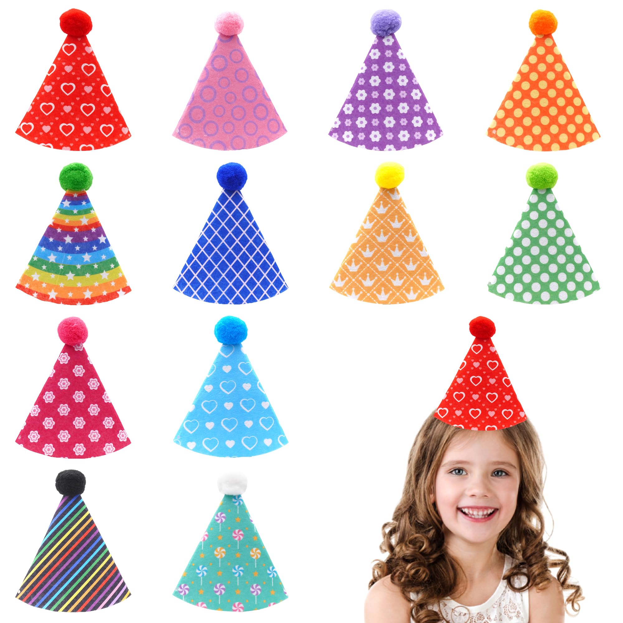 Party Hats Size:Flat size 4.33*5.51"/11*14 CM,open size 2.95*5.11"/7.5*13 CM;elastic string 18.8-59"/48-150 CM,black buckle can make the hats more suitable and stay well Felt Party Hats Packages:12 color,blue,navy,gold,orange,green,bright green,pink,rosy,red,rainbow,black,purple;star,heart,plot,rhombic,circle,crown,flowers,pinstripe,lollipop pattern was printed Birthday Hats Material:Felt,pompom balls,elastic string, plastic buckle;felt material,strong and durablethey,reusable,easy to wear and convenient,will make the party more wonderful Cone Hats Occasions:The hats suitable birthday party,wedding party,various holiday party;not only for kid,adults,but also fit for pets,toys,such as dogs,cats,sheeps,rabbits,piggies,alpaca,stuffed animals toys Reusable Hats:The hats are reusable if you keep them well;colourful fit most people's choices