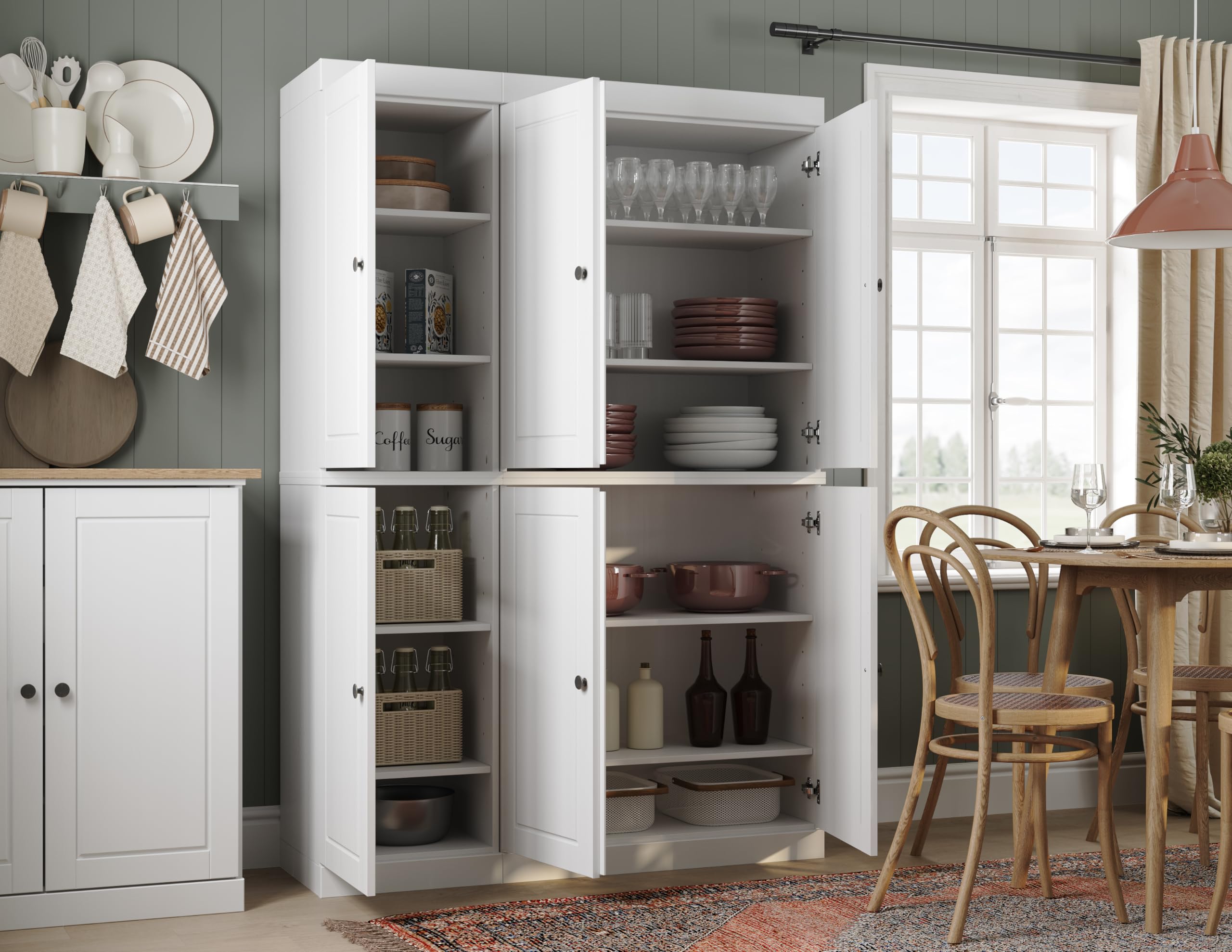 Natural Elegance, Built to Last: Get your home beautifully organized with this freestanding pantry cabinet crafted from 100% solid Brazilian pine. Its clean design and timeless White color finish bring refined style to any kitchen, bedroom, or living space. Raised panel doors and premium construction make this cabinet a durable and elegant addition to your home. Flexible Storage for Any Room: Generously sized at 71.5" high, 48.5" wide and 15.5" deep, this cabinet adapts to your needs. With 4 large and 4 small adjustable solid wood shelves and 32 metal pegs included, it works effortlessly as kitchen cabinet storage, bathroom storage, utility cabinet, or even a book cabinet with storage Rock-Solid Stability and Versatility: This storage cupboard is made from kiln-dried solid wood—no particle board or plastic cabinets here. Its construction prevents warping, while its weight and structure make it naturally stable. Multiple units can be stacked or secured with a wall anchor for enhanced safety and peace of mind. Can also be split into units beside each other. Customizable variations available Designed for Everyday Convenience: Built for real homes, the cabinets height is optimized for easy access - no more straining to reach high shelves. Soft-close hinges offer smooth door operation while ensuring longevity. Create your own tea & coffee pantry cabinet or locker cabinet alternative Fantastic Quality and Support: Here at Palace Imports we check every component for quality before shipping and offer optional wood samples for matching. Need help? Our responsive team is here to ensure your satisfaction from delivery to long-term use. Each unit ships in multiple boxes with detailed instructions and all necessary hardware