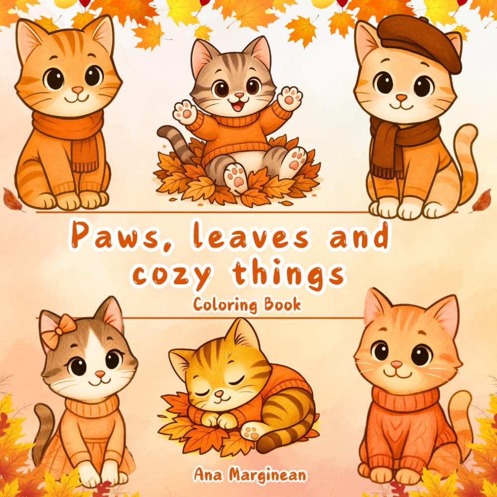 Paws, Leaves & Cozy Things: Autumn Cat Coloring Book for Relaxation and Mindfulness Cute and Cozy Cats in Fall Scenes for Kids, Teens, and Adults โ Fun and Calming Coloring Pages for Stress Relief (Cat Tales in Color: A Feline Coloring Journey) ๐๐พ Cozy up with the ultimate fall coloring experience! Paws, Leaves & Cozy Things is a heartwarming cat-themed coloring book that captures the magic of autumn through 50 delightful designs. Perfect for cat lovers of all ages, this book features adorable cats wearing cozy sweaters, jumping in piles of leaves, roasting marshmallows, sipping warm drinks, and playing in the rain โall set against charming fall landscapes. Whether you're a kid, teen, or adult, this book invites you to relax, de-stress, and escape into a world of fluffy felines and crisp autumn air. ๐จ Whatโs Inside: 50 unique, hand-drawn illustrations of cute cats enjoying classic autumn activities - Single-sided pages - Wholesome scenes including pumpkin patches, forest walks, rainy days, campfires, cozy reading corners, and more - Designed for kids, teens, and adults โ accessible for younger artists but charming and detailed enough for grown-up cat lovers - Perfect for relaxation, mindfulness, and stress relief during the fall season - Clean, bold linework ideal for crayons, colored pencils, or gel pens ๐งก Why Youโll Love It: A seasonal treat for anyone who loves autumn, cozy vibes, and cute cats - Great for screen-free fun , rainy day creativity, and winding down after a long day - Makes a thoughtful gift for cat lovers, fall enthusiasts, or creative friends and family - A charming addition to your bookshelf alongside the popular Paws and Snowflakes, Paws and Sunshine and Paws and Petals This book is part of the Cat Tales in Color: A Feline Coloring Journey series โ a collection of seasonal and themed cat coloring books designed to bring calm, joy, and a smile to your face. ๐ Grab your favorite blanket, a warm drink, and your coloring tools โ and get ready to fall in love with Paws, Leaves & Cozy Things.