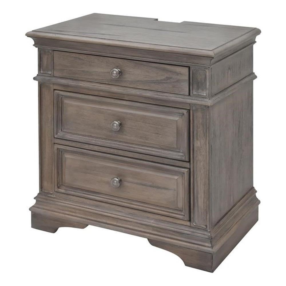 Solid wood frame (Acacia), Mindi Veneers over MDF Finish: Distressed Driftwood Constructed of hardwood solids and veneers Hardware knobs in soft pewter finish Nightstand features two USB connections for easy recharging and two electrical outlets for easy access Drawers feature roller bearing metal side guides Drawer interiors are sanded and sealed 3 drawers for bedside storage Shaped moldings Multi-step distressed finish adds vintage charm features vintage styling in a classical bedroom collection. Sturdy construction using hardwood solids and veneers in a multi-step waxed driftwood finish with the perfect amount of distressing. The nightstand offers three drawers with side mounted roller bearing drawer glides for smooth open and closing and a convenient USB and electrical port on the back. Gorgeous shaped moldings and framed drawer fronts accented by soft pewter drawer knobs, create an elegant farmhouse style.Features:- Solid wood frame (Acacia), Mindi Veneers over MDF- Finish: Distressed Driftwood- Constructed of hardwood solids and veneers- Hardware knobs in soft pewter finish- Nightstand features two USB connections for easy recharging and two electrical outlets for easy access- Drawers feature roller bearing metal side guides- Drawer interiors are sanded and sealed- 3 drawers for bedside storage- Shaped moldings- Multi-step distressed finish adds vintage charmSpecifications:- Product Dimensions: 29.5" H x 28" W x 17" D- Product Weight: 66 lbs